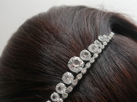 Elegancki diadem w klasycznej formie. Wykonany z metalowej, posrebrzanej opaski i tiary z kryształowych oczek o różnej wielkości. Zabezpieczony przed utlenianiem, dzięki czemu nie zmienia barwy. Nie zawiera niklu.