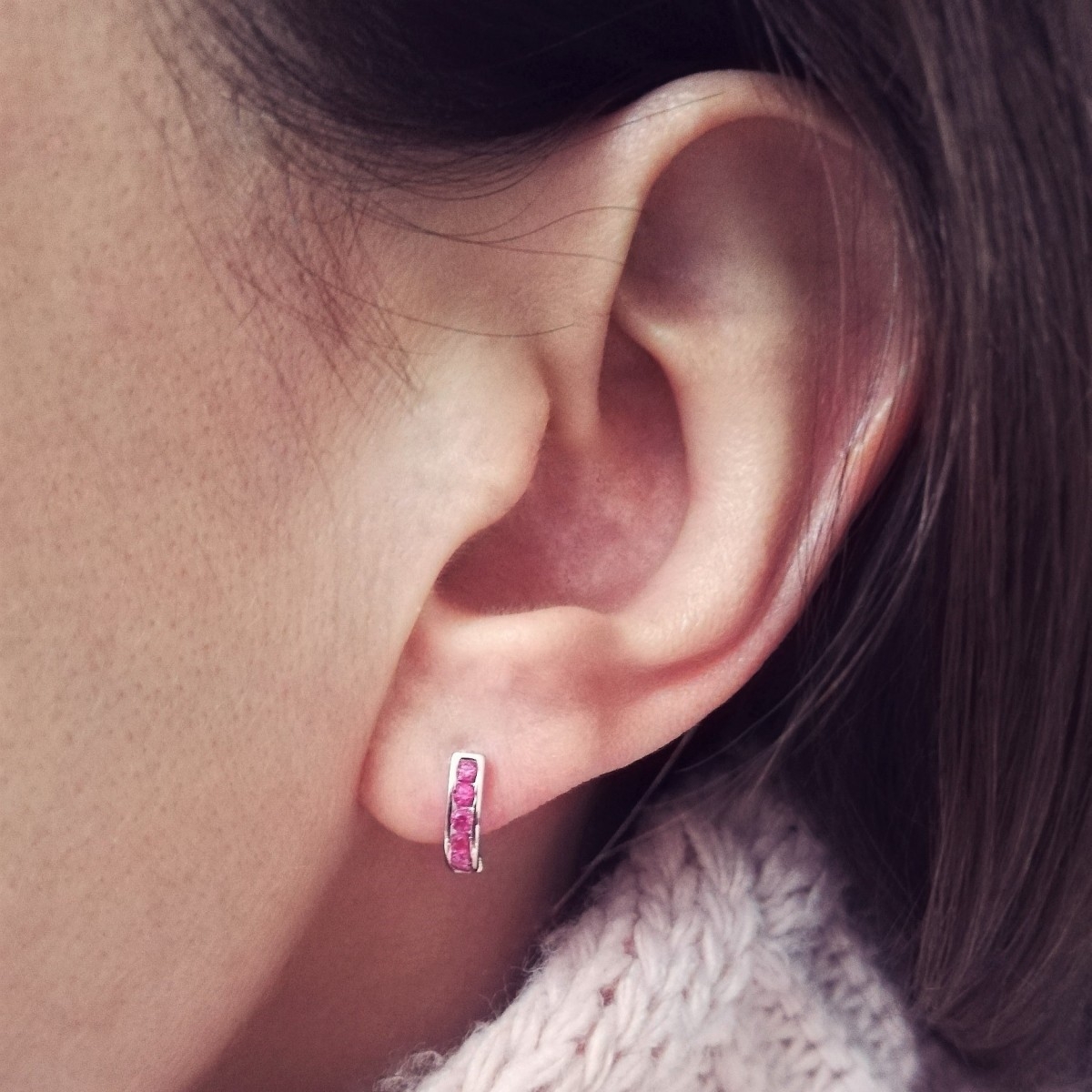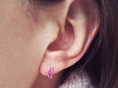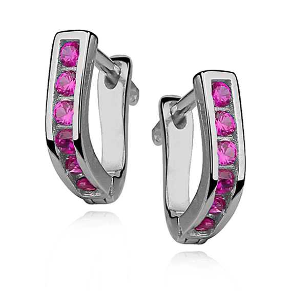 Kolczyki w kształcie podkówek zdobione ciemnoróżowymi cyrkoniami. Uszlachetnione rodem, by dłużej zachowały jasną barwę, blask i były odporniejsze na uszkodzenia.