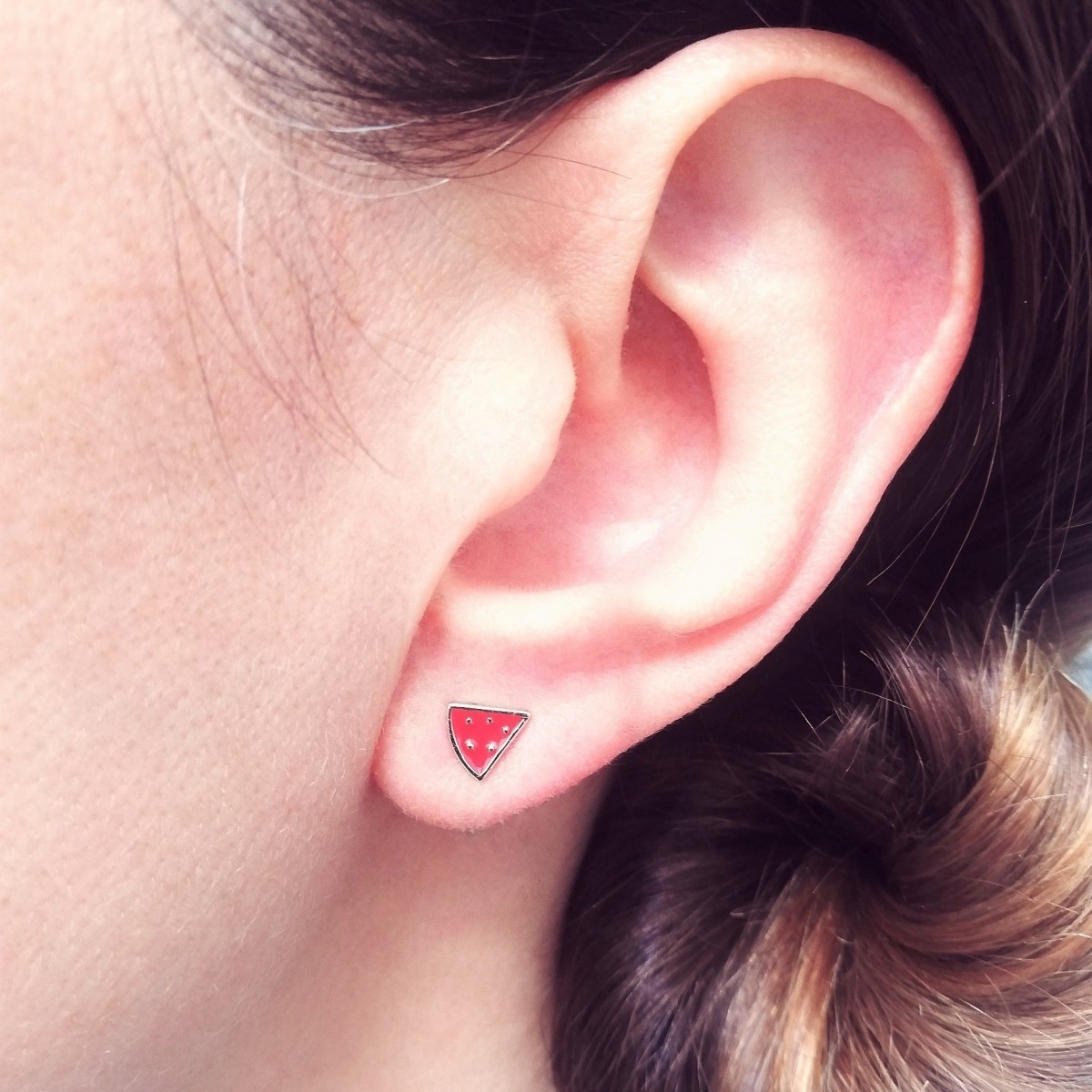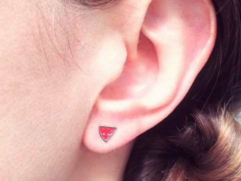 Kolczyki z motywem arbuza. Zdobione emalią. Uszlachetnione rodem, by dłużej zachowały jasną barwę, blask i były odporniejsze na uszkodzenia.