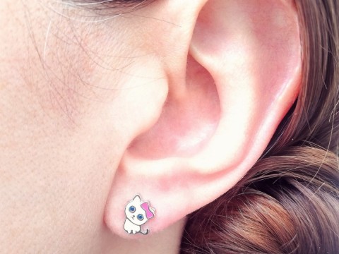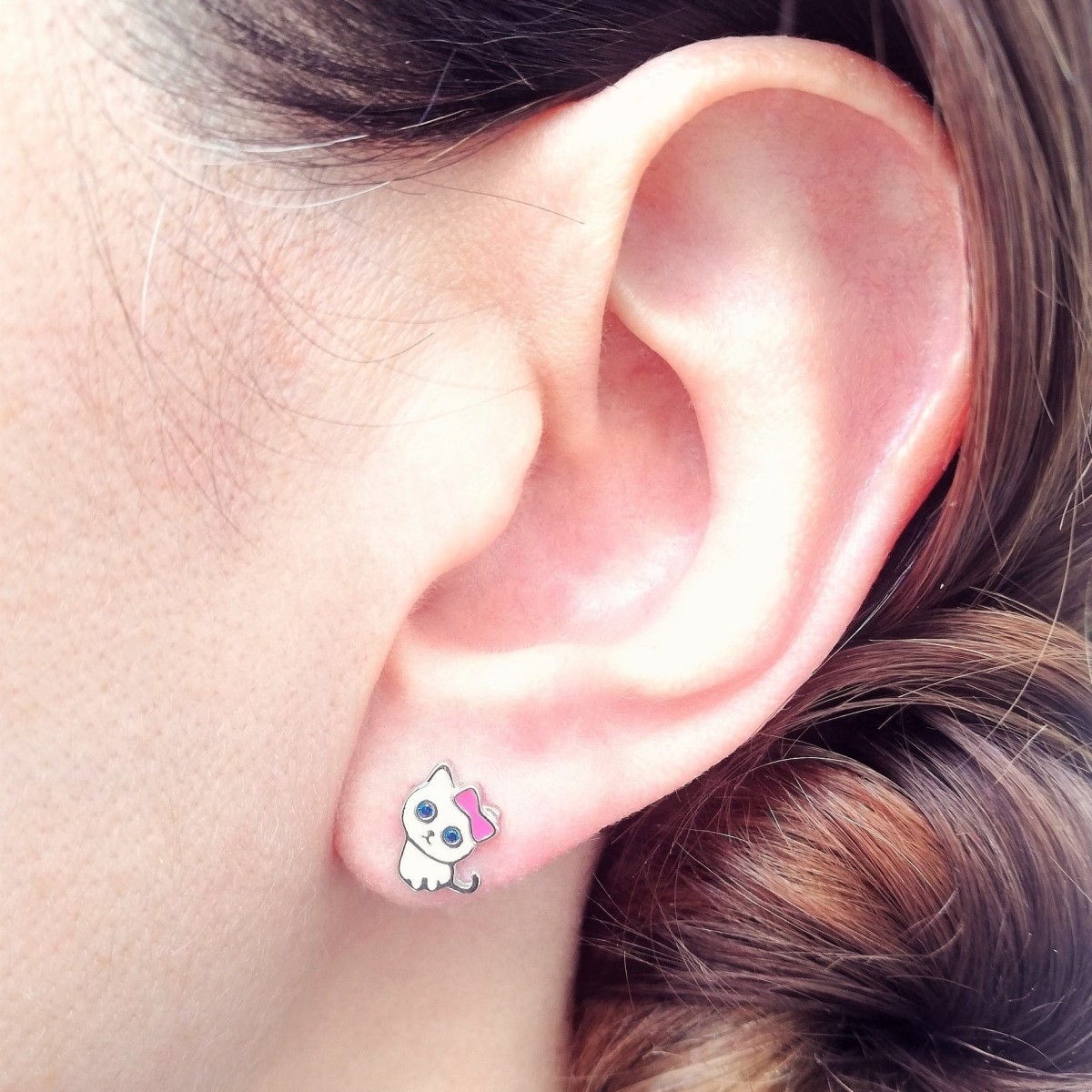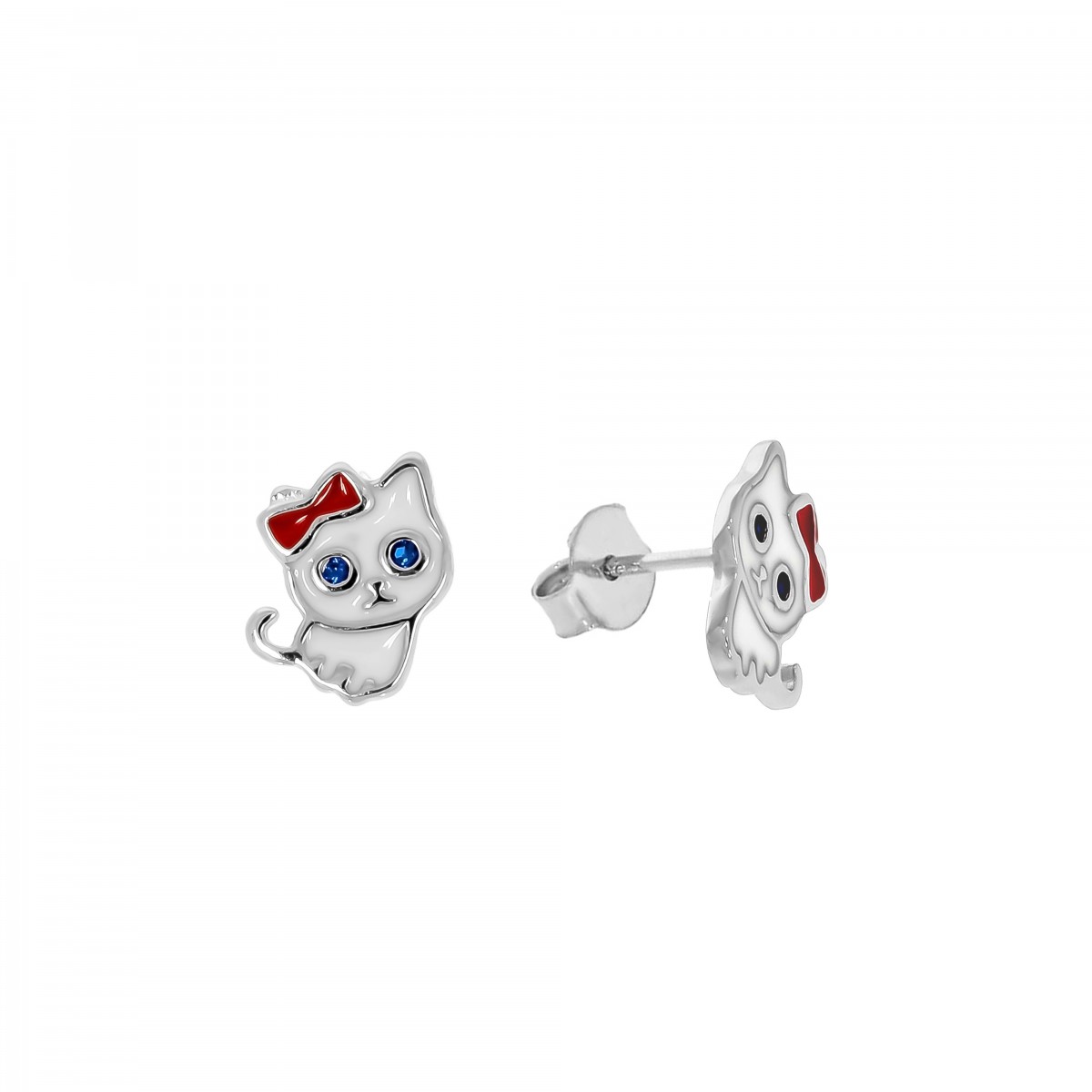 Kolczyki z motywem kotka. Zdobione emalią. Uszlachetnione rodem, by dłużej zachowały jasną barwę, blask i były odporniejsze na uszkodzenia.