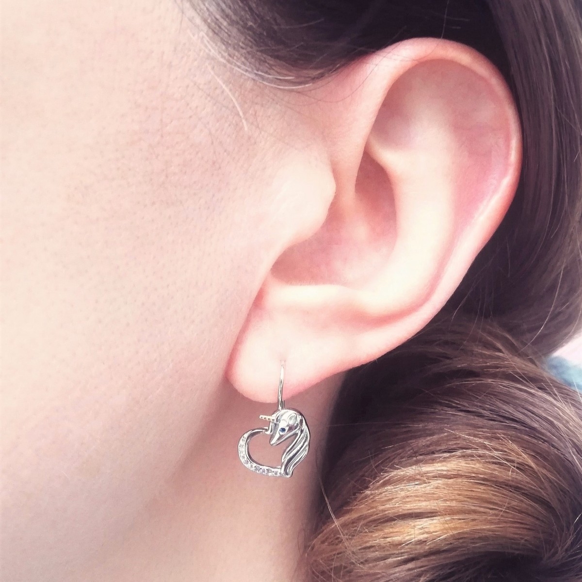 Kolczyki z motywem serca i jednorożca. Zdobione jasnoróżowymi cyrkoniami i szafirowym oczkiem z cyrkonii. Róg pokryty powłoką z żółtego złota. Uszlachetnione rodem, by dłużej zachowały jasną barwę, blask i były odporniejsze na uszkodzenia.