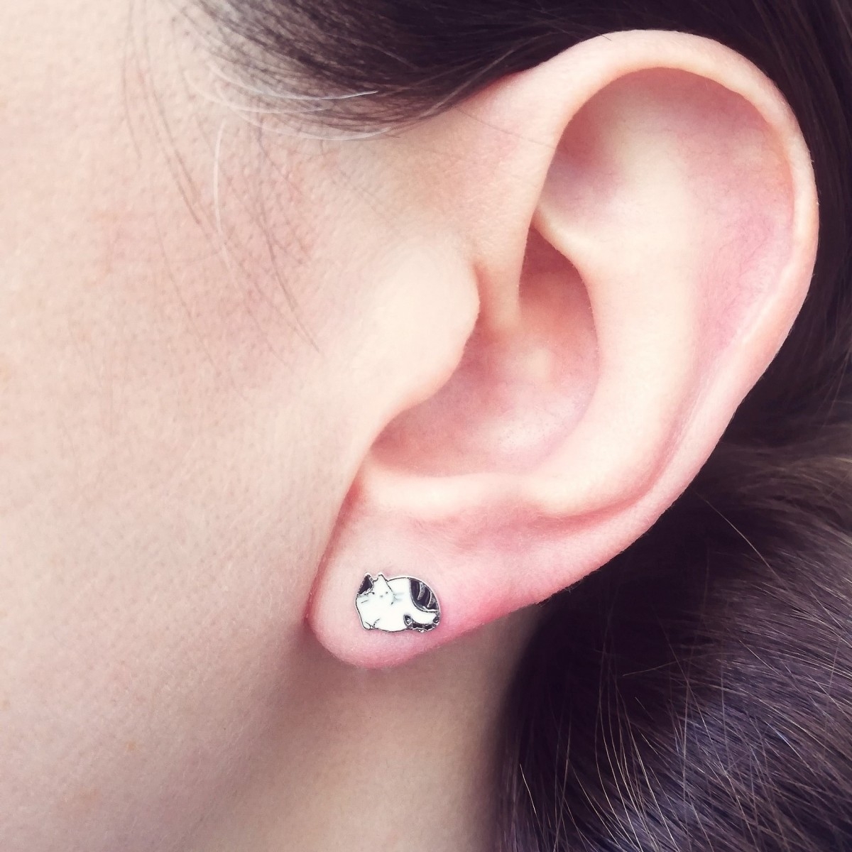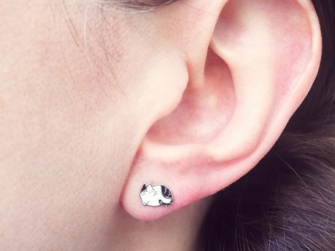 Kolczyki z motywem czarno-białego kotka. Zdobione emalią. Uszlachetnione rodem, by dłużej zachowały jasną barwę, blask i były odporniejsze na uszkodzenia.
