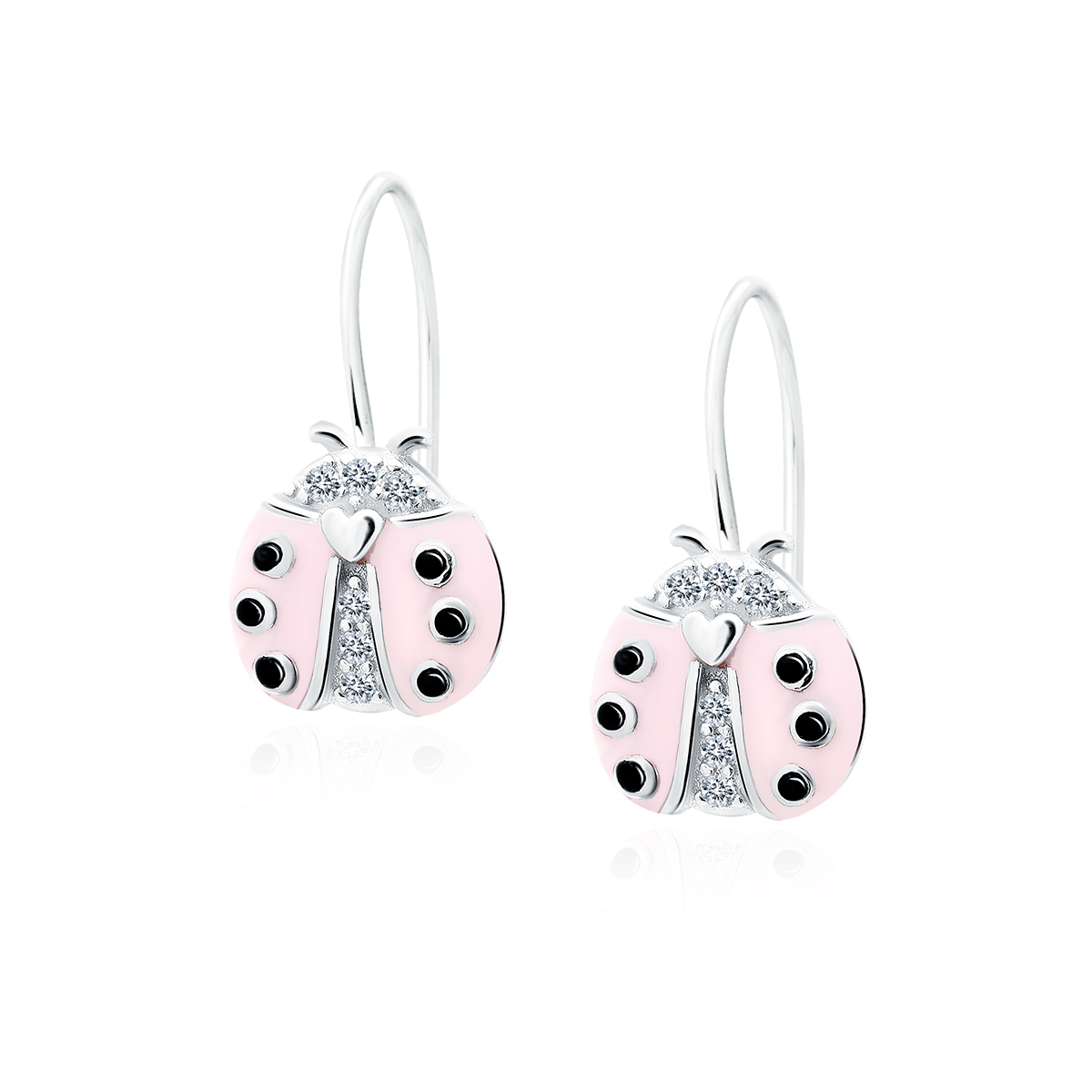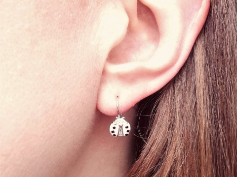 Kolczyki z motywem biedronki. Zdobione cyrkoniami, malowane emalią. Uszlachetnione rodem.