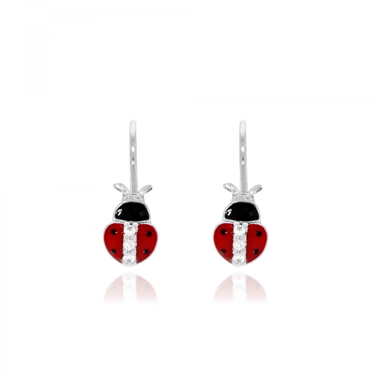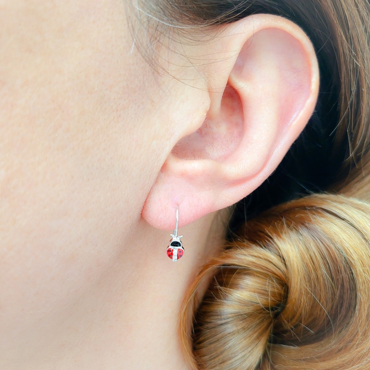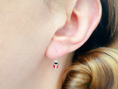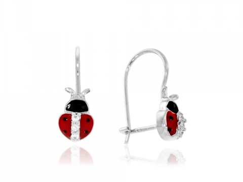 Rodowane i emaliowane kolczyki na biglu z motywem biedronki. Zdobione cyrkoniami. Uszlachetnione rodem.