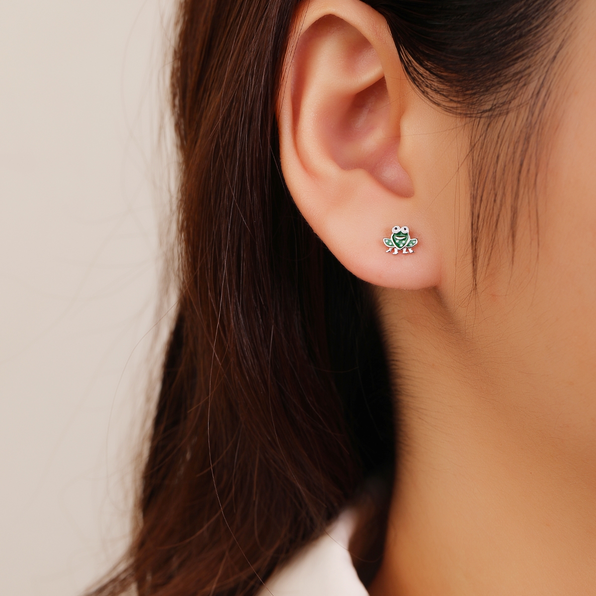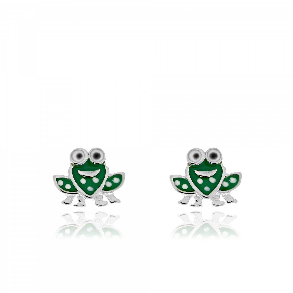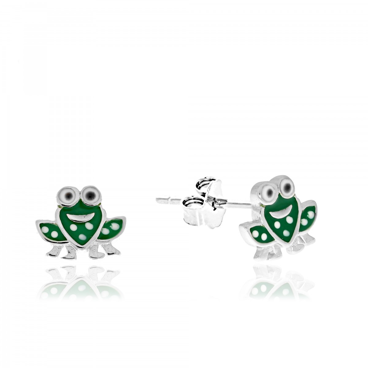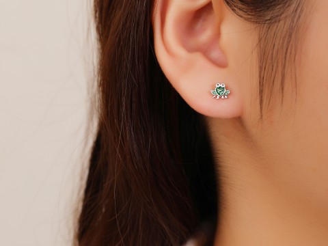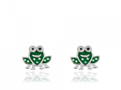 Rodowane i emaliowane kolczyki z motywem żabki. Zapinane na sztyft.