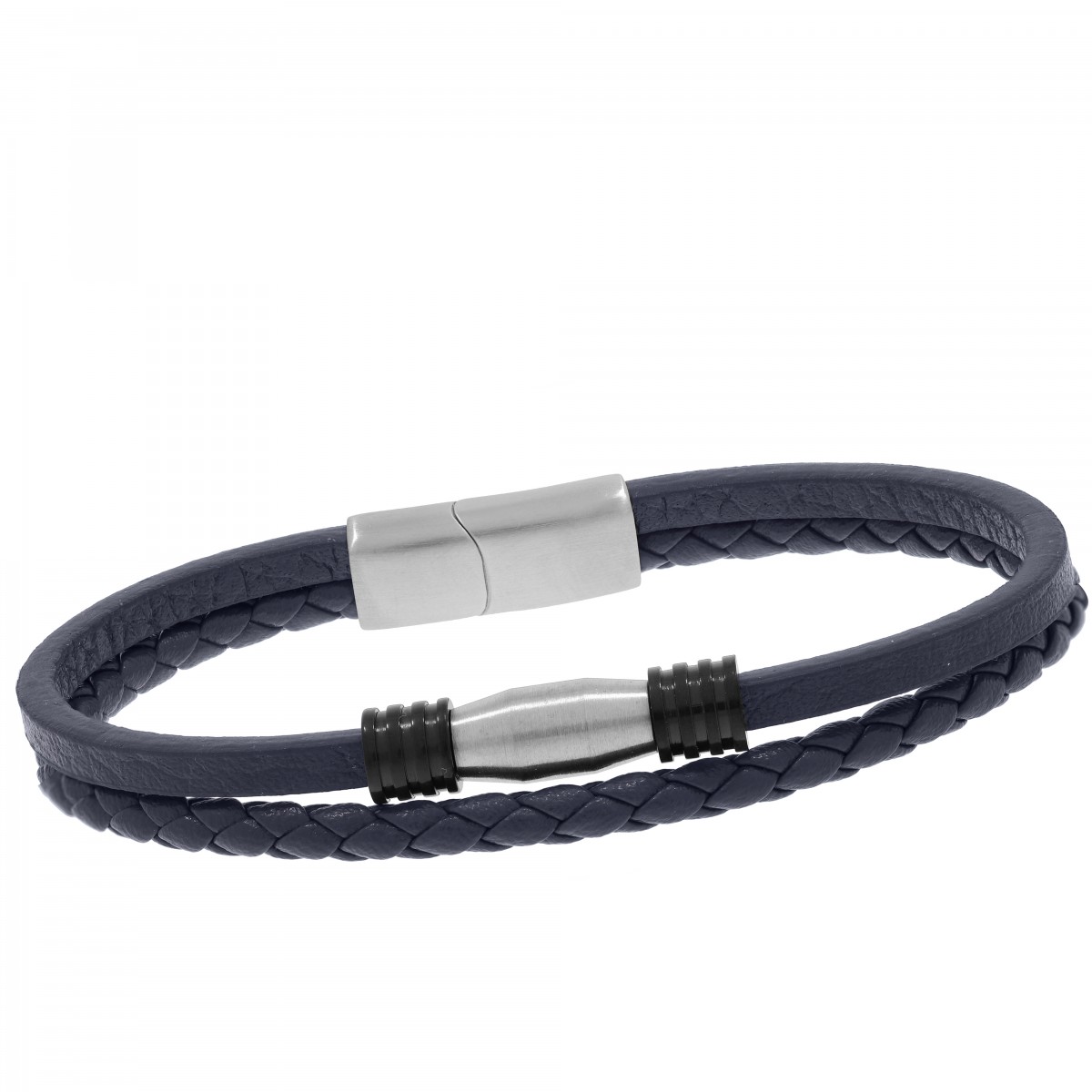Bransoletka ze skóry ekologicznej i stali. Wykonana jest z dwóch pasków oplatającego nadgarstek. Składa się z plecionej i gładkiej skóry oraz zdobnego elementu stalowego.