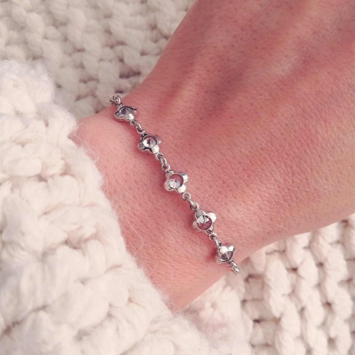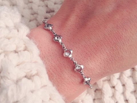 Bransoletka wykonana z łańcuszka o splocie rolo. Zdobiona dwustronnie pięcioma kwiatuszkami z białymi cyrkoniami. Uszlachetniona rodem, by dłużej zachowała jasną barwę, blask i była odporniejsza na uszkodzenia.