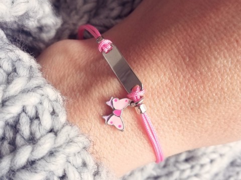 Dziecięca bransoletka wykonana z jubilerskiego sznurka i srebrnych elementów. Zdobiona blaszką i zawieszką w kształcie kokardki obustronnie pomalowanej emalią. Pasuje na szczupłą, dziecięcą rączkę. Dzięki przedłużce posiada możliwość regulacji. Zapinana na federing.