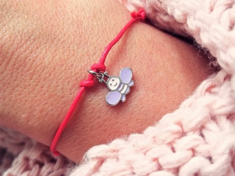 Dziecięca bransoletka wykonana z jubilerskiego sznurka i srebrnej zawieszki w kształcie pszczółki obustronnie pomalowanej emalią. Pasuje na szczupłą, dziecięcą rączkę. Posiada dużą możliwość regulacji.