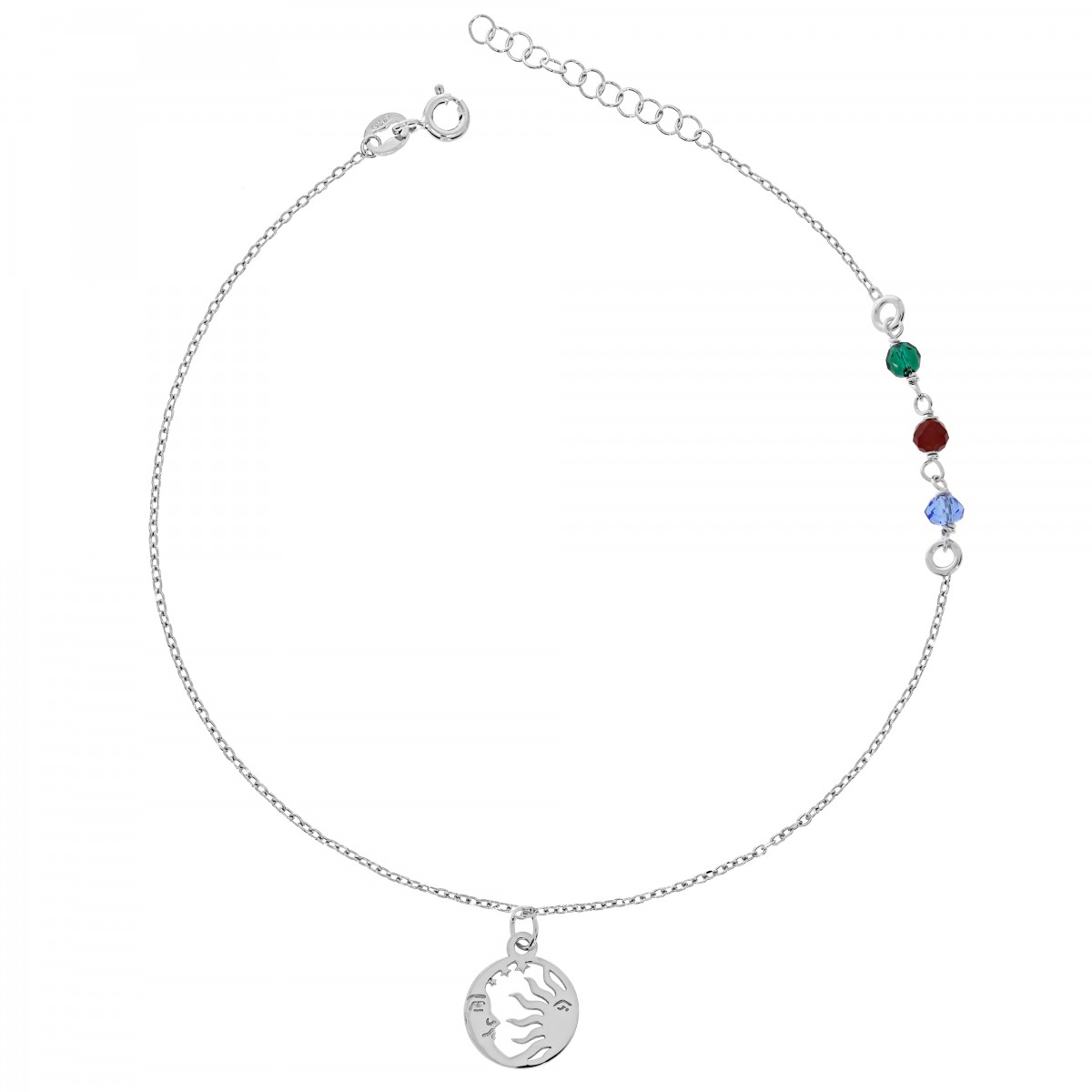Bransoletka na nogę wykonana z klasycznego łańcuszka o splocie ankier. Zdobiona okrągłą zawieszką z motywem słońca i księżyca oraz trzema kryształkami w kolorach: zielonym, czerwonym i niebieskim. Zapinana na federing z przedłużką. Uszlachetniona rodem.