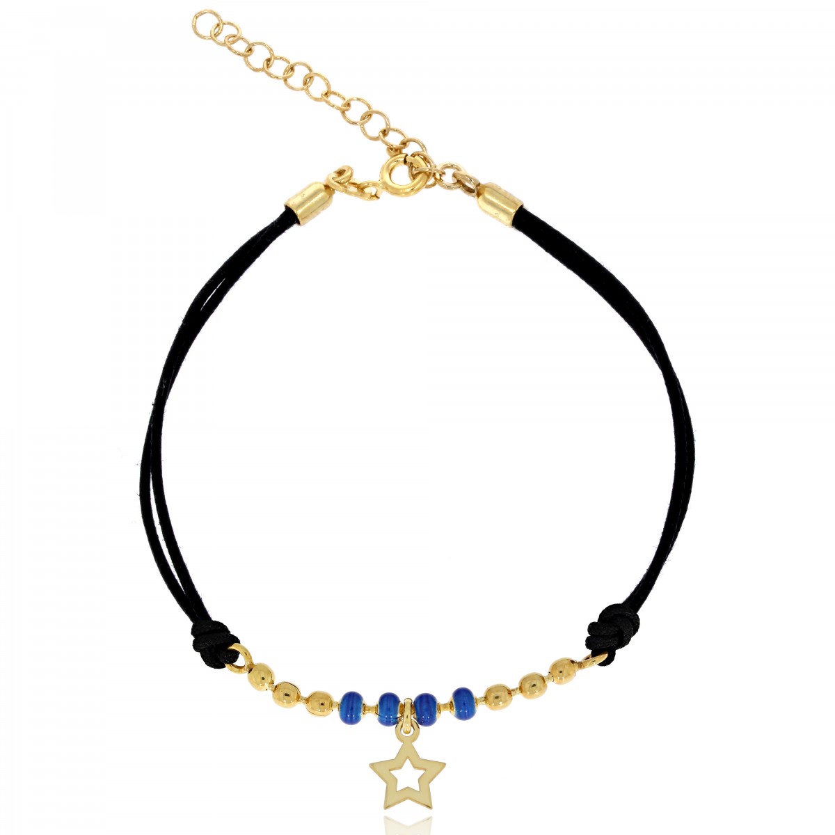 Bransoletka wykonana z czarnego miękko układającego się sznurka i elementu zdobnego o długości 4 cm złożonego ze złoconych kuleczek, emaliowanych koralików w kolorze granatowym i zawieszki w kształcie gwiazdki. Zapinana na federing. Posiada srebrną przedłużkę.