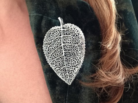 Duży ażurowy liść o podwójnym zastosowaniu. Może być broszką lub zawieszką. Zawiera szpilkę do przypięcia oraz uszko do zawieszenia. Wykonany z oksydowanego srebra dającego miejscami efekt lekko przyciemnionego. Zapięcie posiada zabezpieczenie przed przypadkowym odpięciem.
