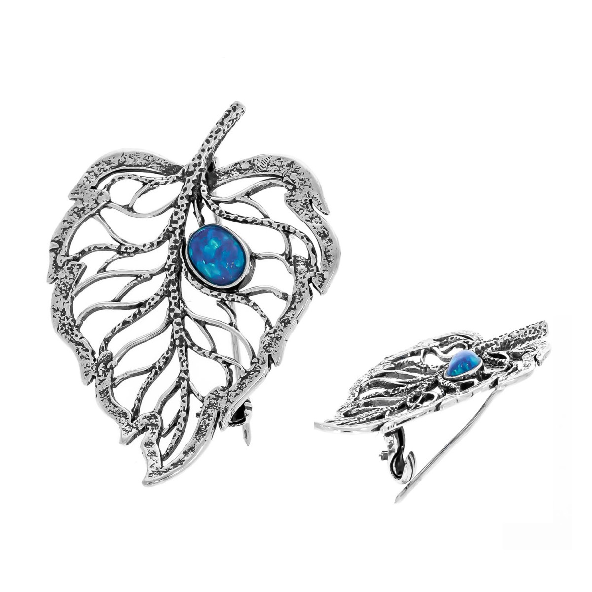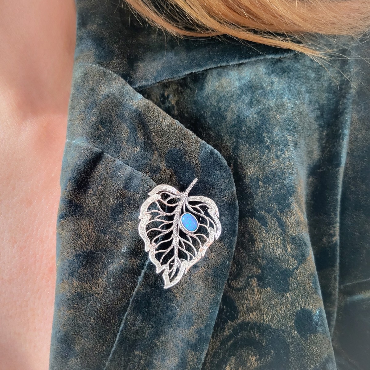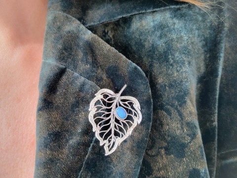 Ażurowy listek wykonany z oksydowanego srebra zdobiony owalnym oczkiem z syntetycznego niebieskiego opala. Zapięcie broszki posiada zabezpieczenie przed przypadkowym odpięciem.