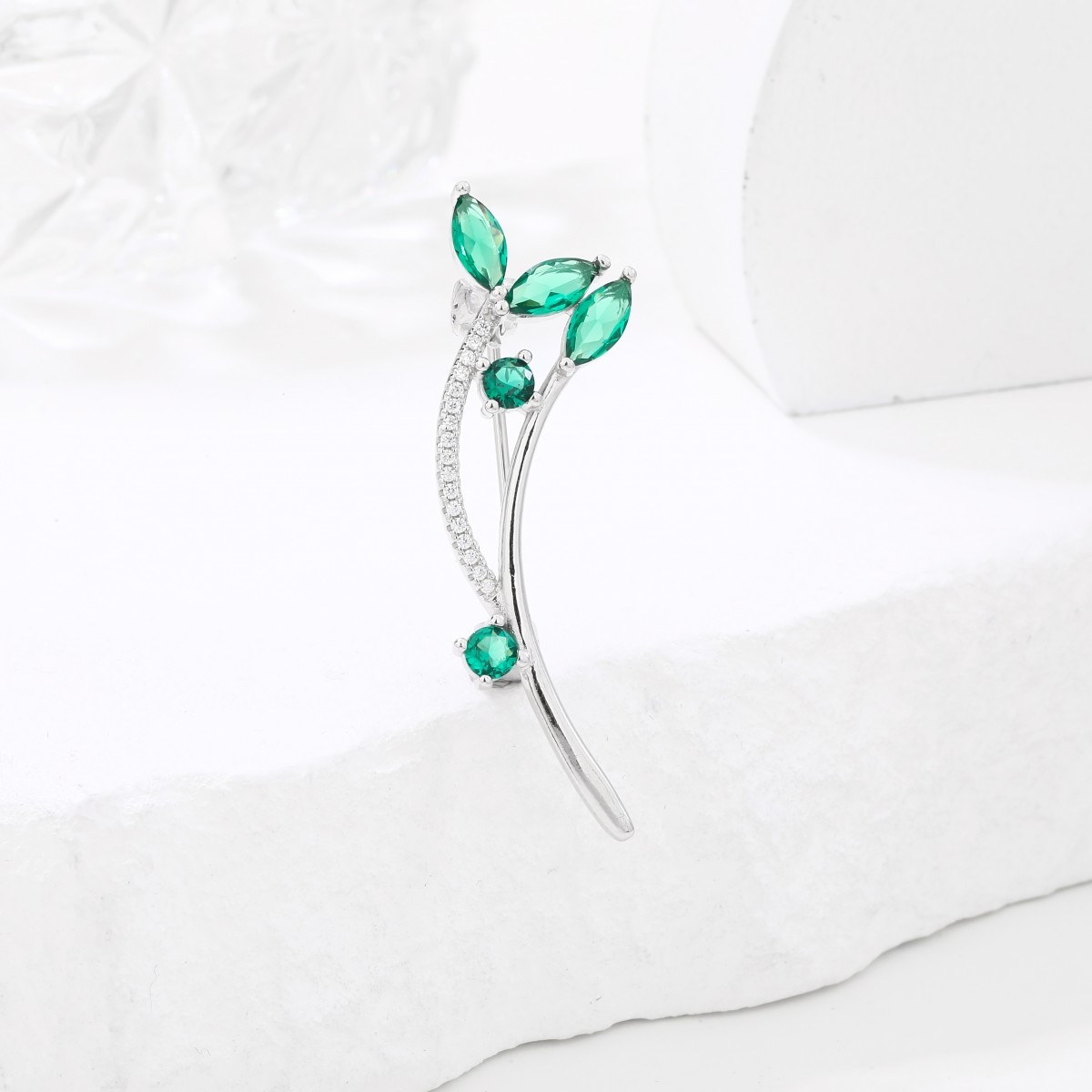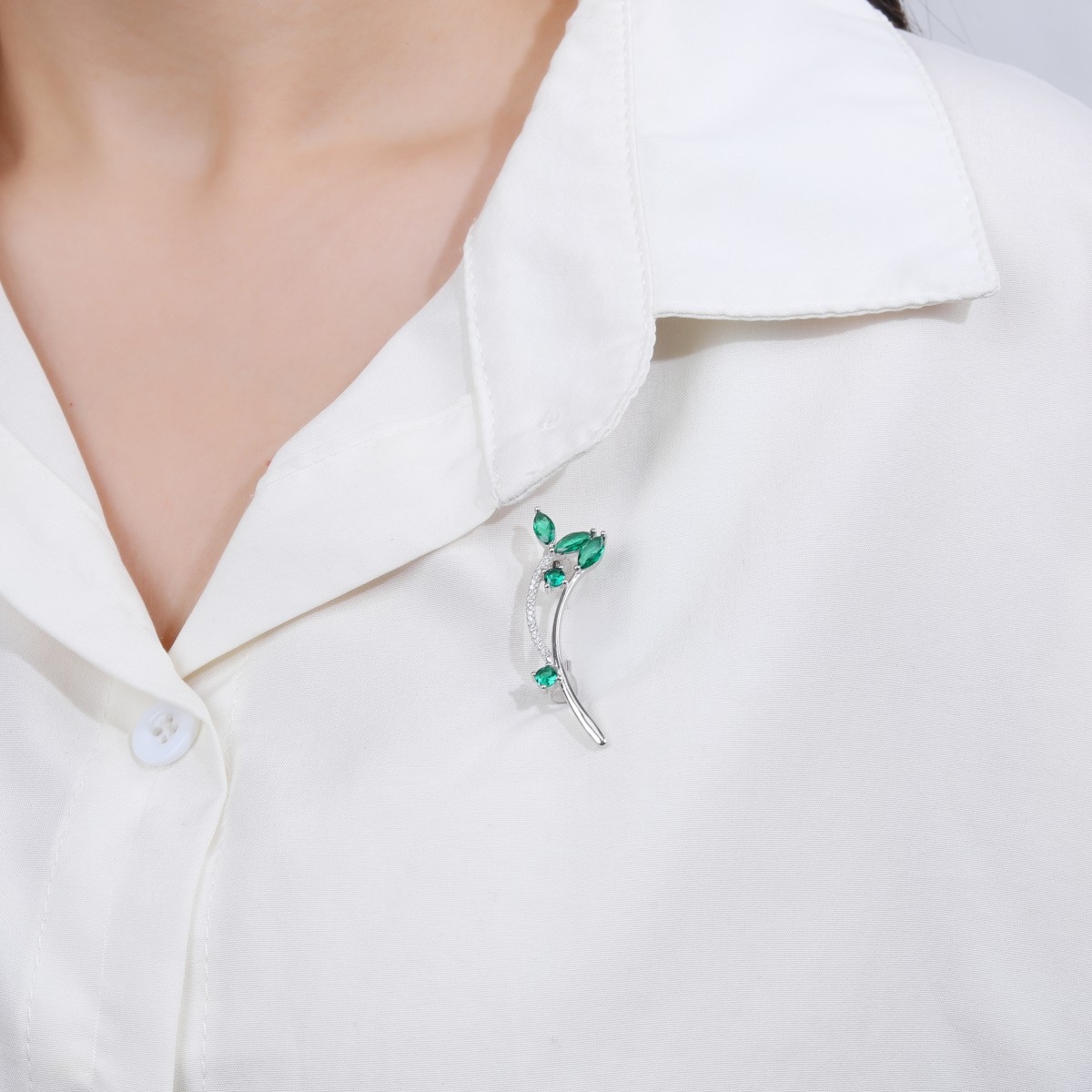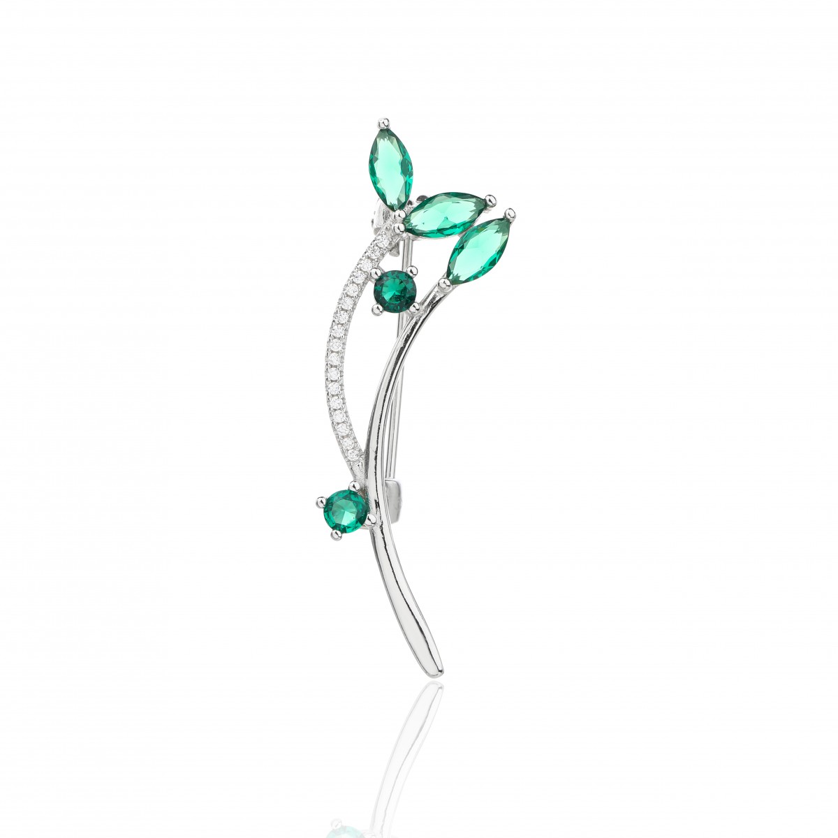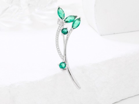 Rodowana broszka z motywem gałązki. Zdobiona drobnymi białymi cyrkoniami i większymi w kolorze szmaragdowym. Wykończona wysokim połyskiem. Zamykana szpilką w chroniącym czubek małym serduszku.