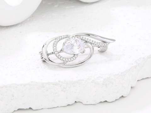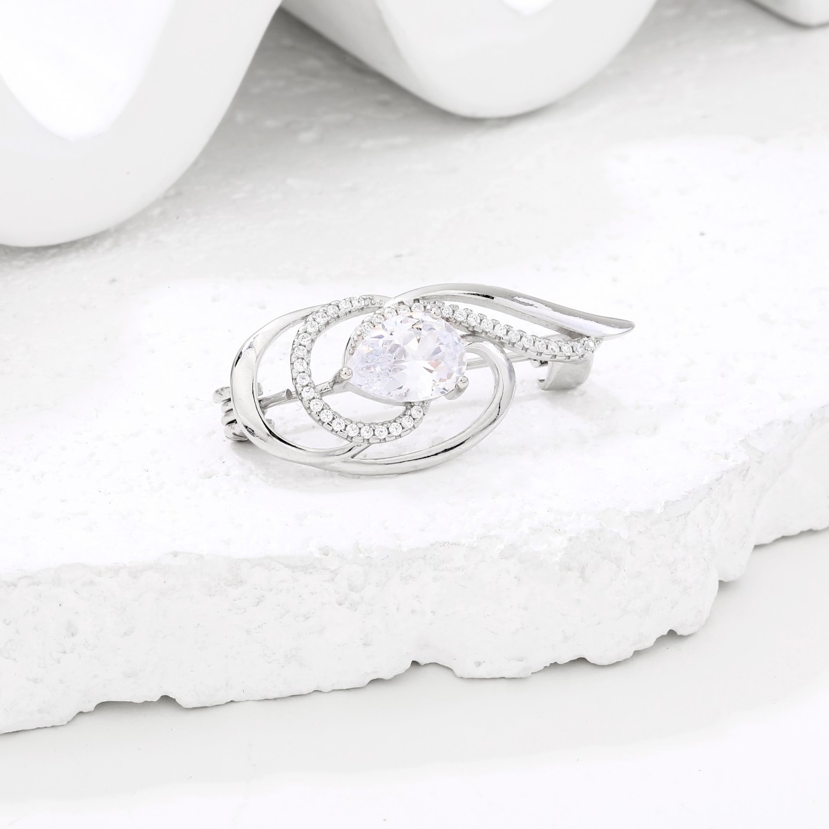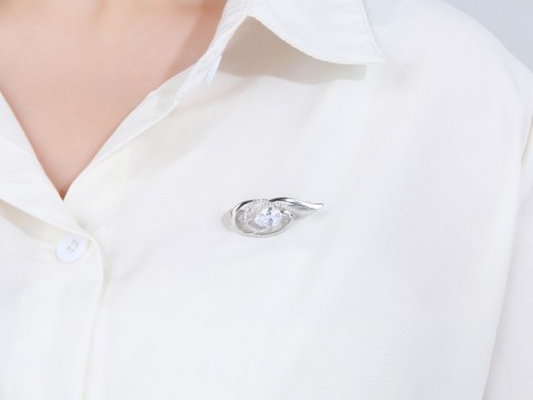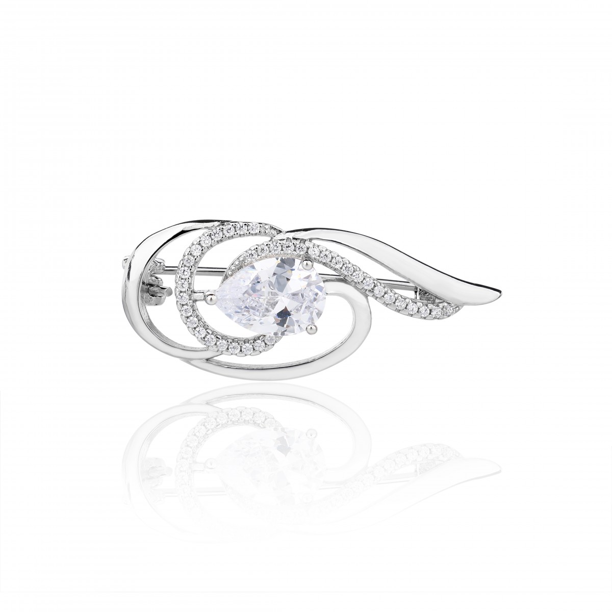 Rodowana broszka zdobiona drobnymi białymi cyrkoniami i jedną większą w kształcie łezki. Wykończona wysokim połyskiem. Zamykana szpilką w chroniącym czubek małym serduszku.