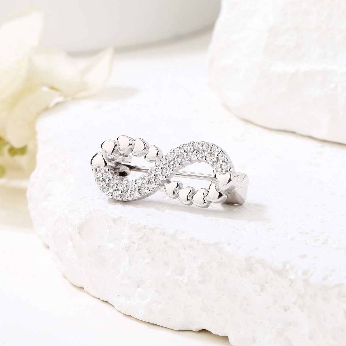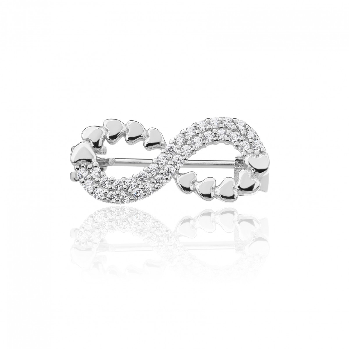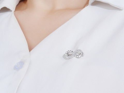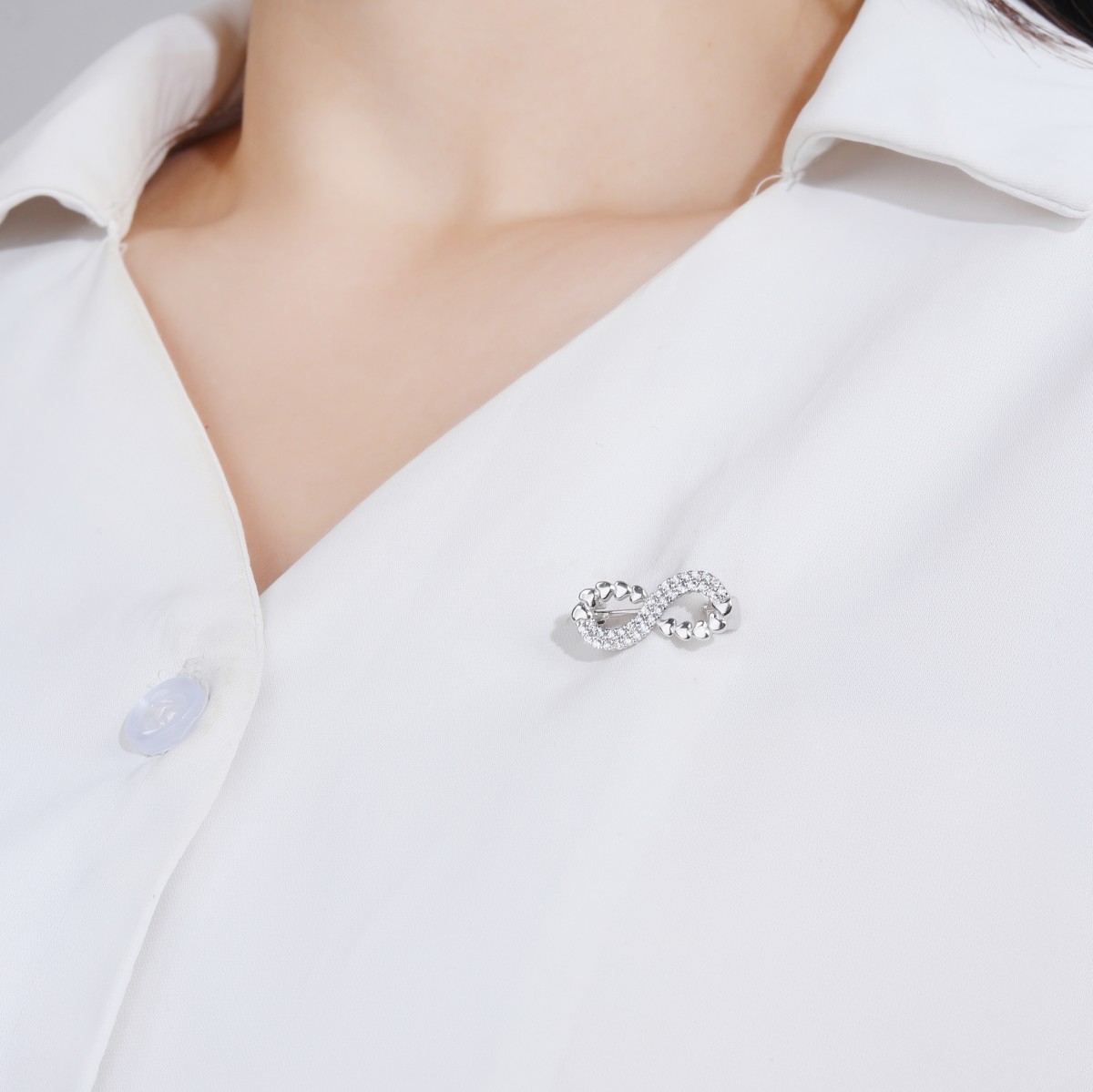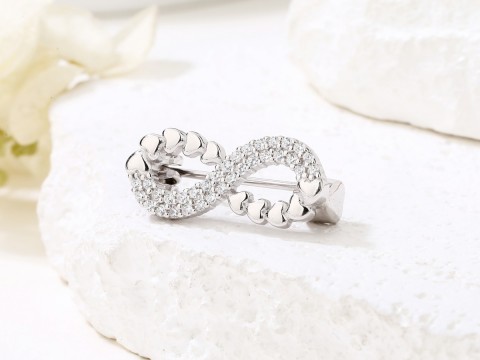 Rodowana broszka ze znakiem nieskończoności i serduszkami. Wysadzana białymi cyrkoniami. Zamykana szpilką w chroniącym czubek małym serduszku.