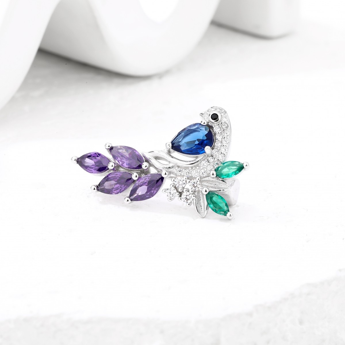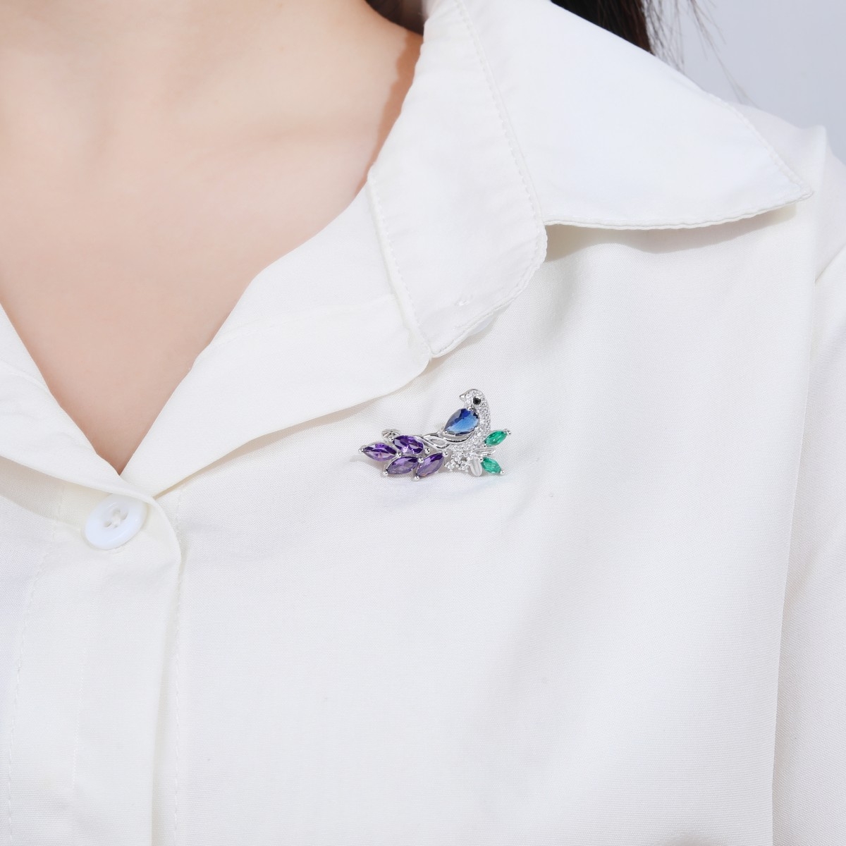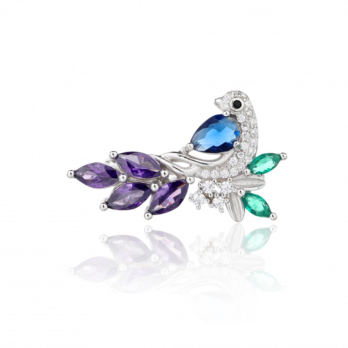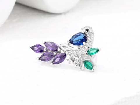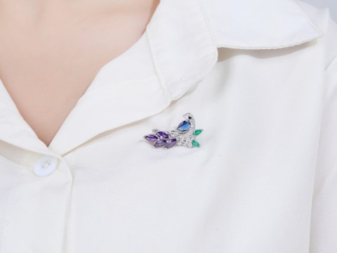 Rodowana broszka z motywem ptaka. Zdobiona kolorowymi cyrkoniami. Wykończona połyskiem. Zamykana szpilką w chroniącym czubek małym serduszku.