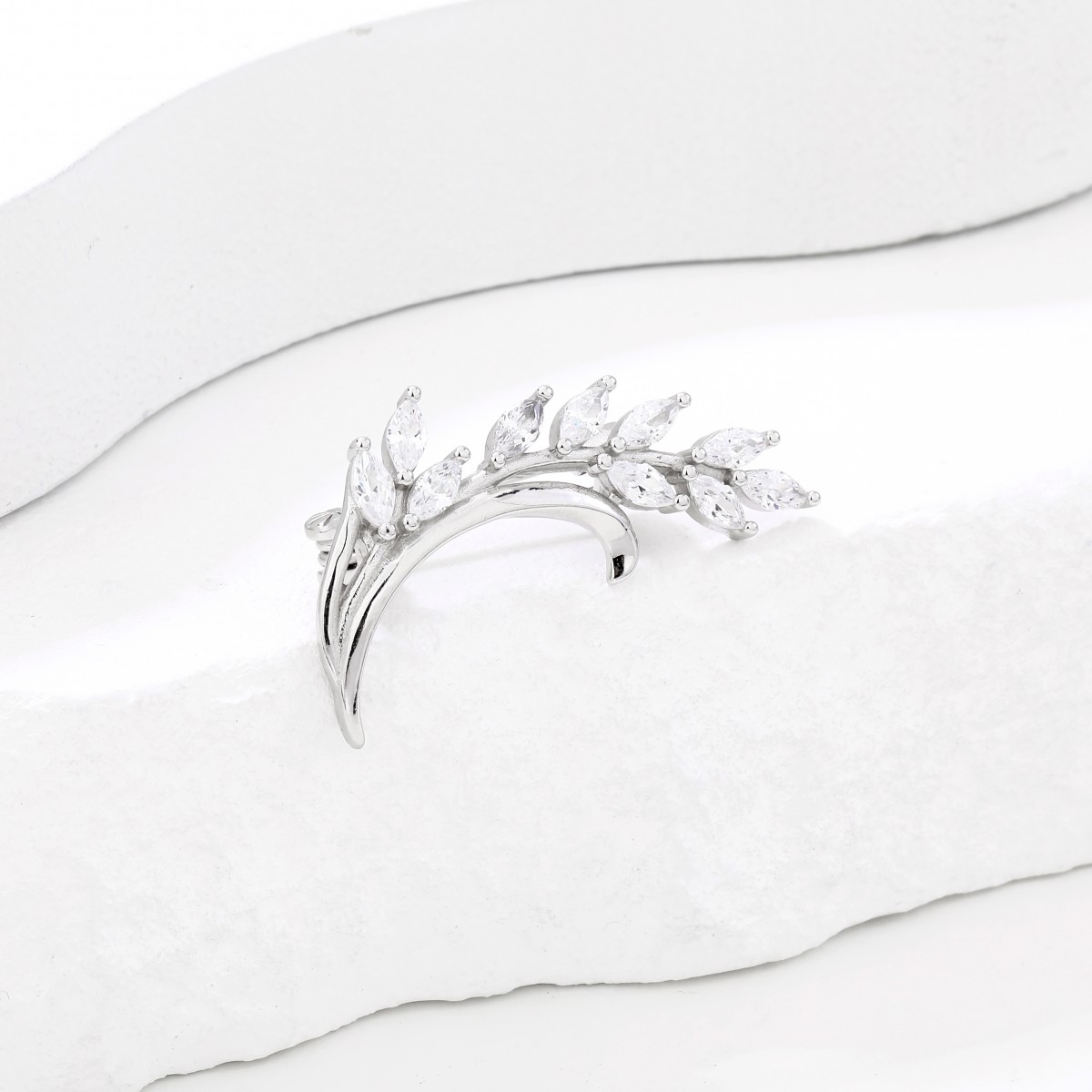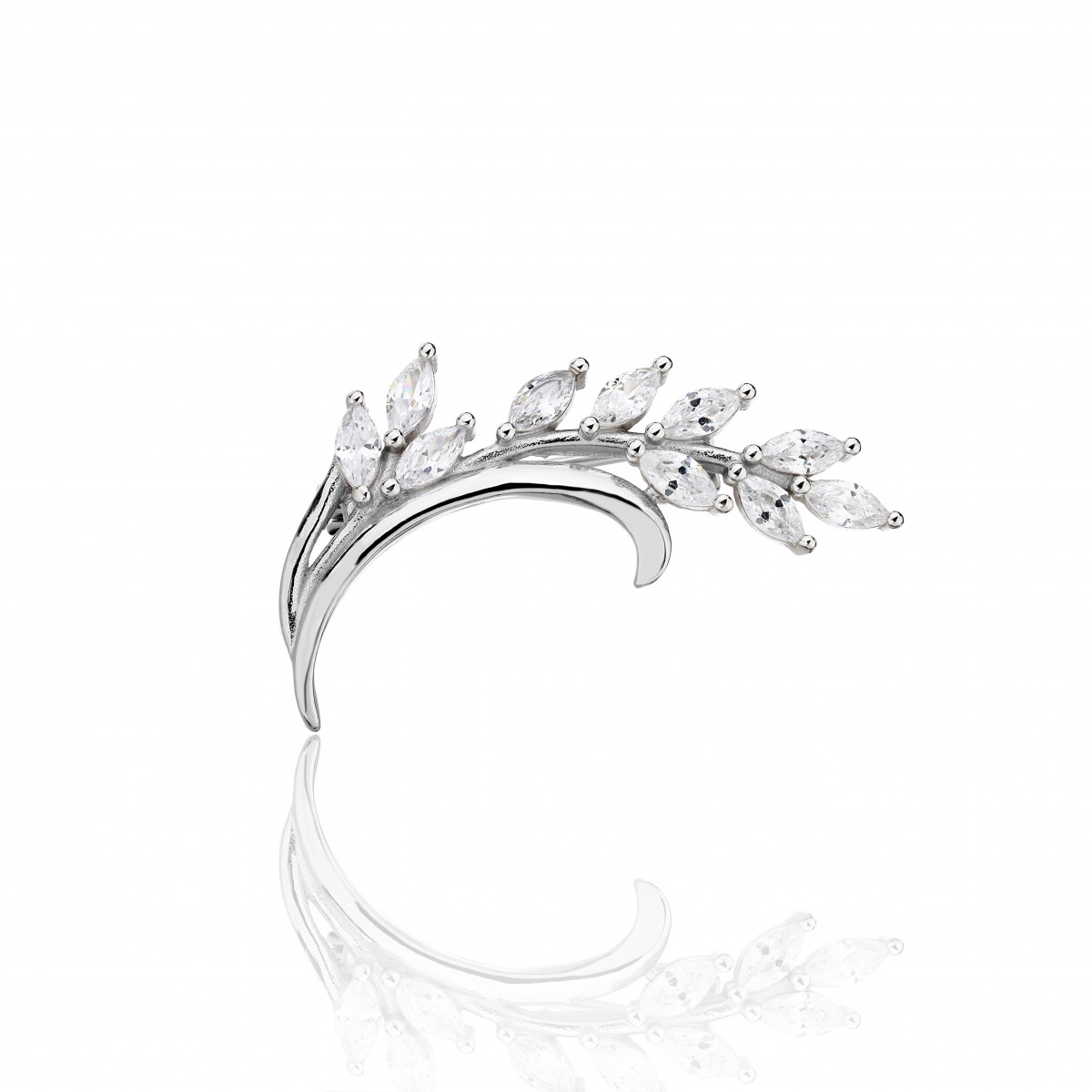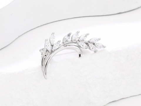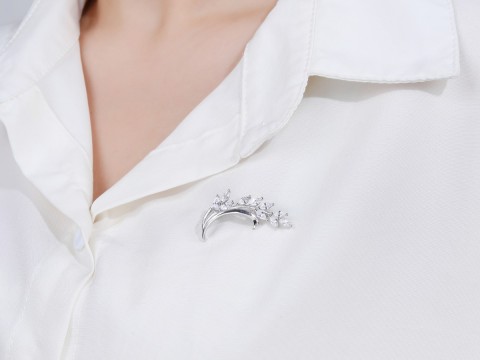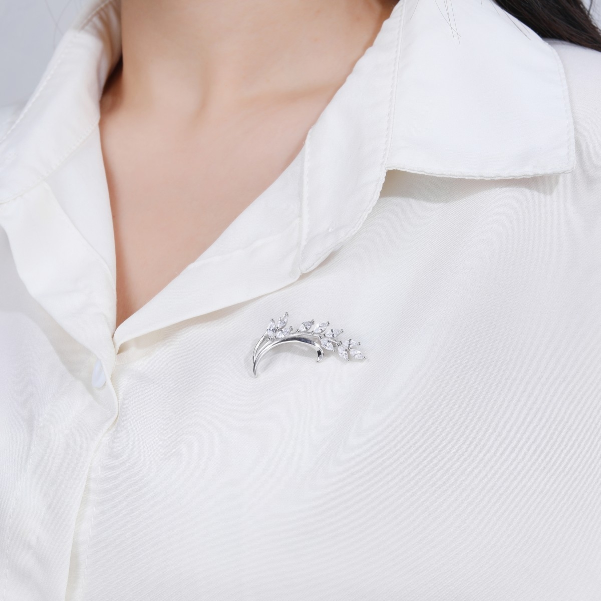 Rodowana broszka z motywem gałązki. Zdobiona białymi cyrkoniami. Wykończona połyskiem. Zamykana szpilką w chroniącym czubek małym serduszku.