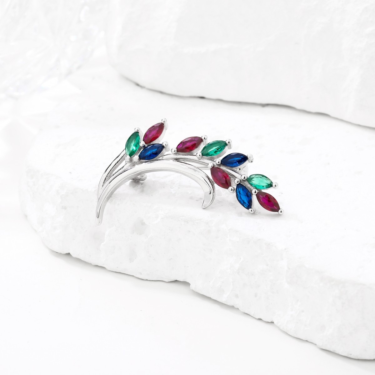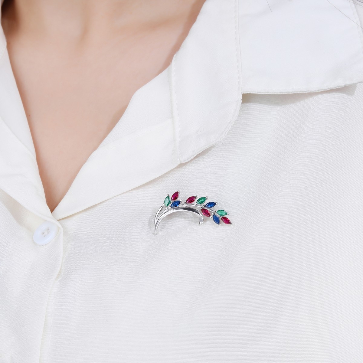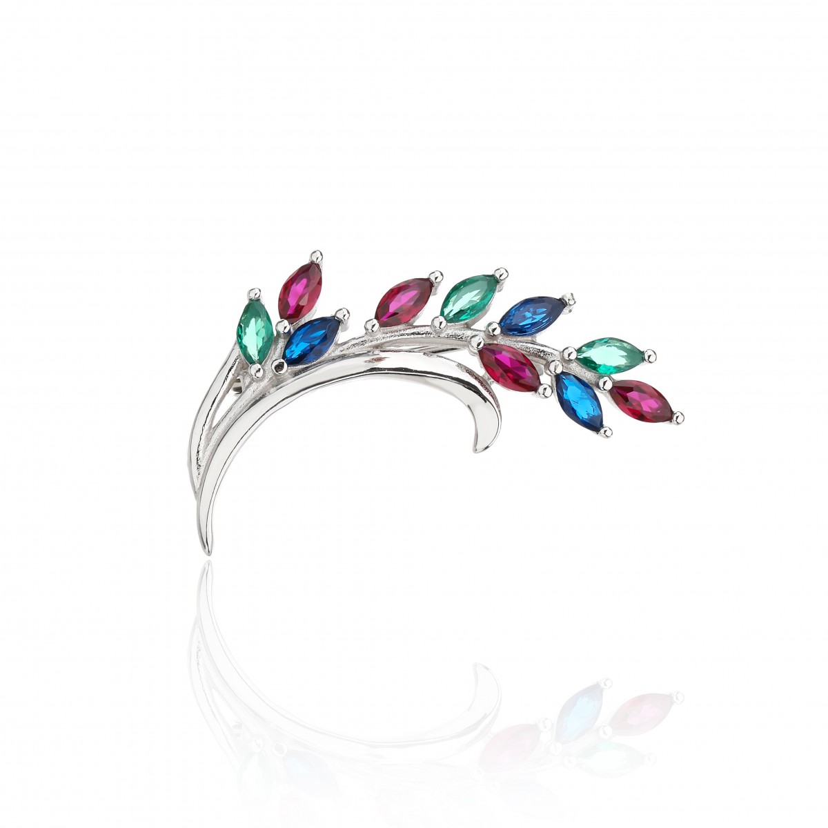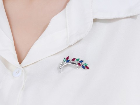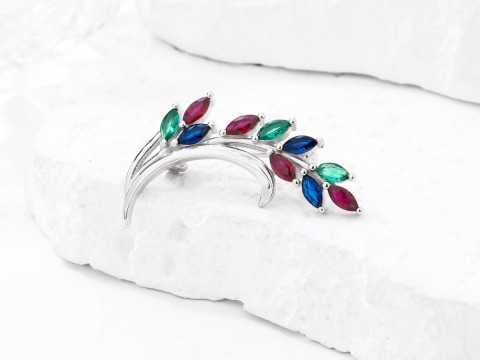 Rodowana broszka z motywem gałązki. Zdobiona kolorowymi cyrkoniami. Wykończona połyskiem. Zamykana szpilką w chroniącym czubek małym serduszku.