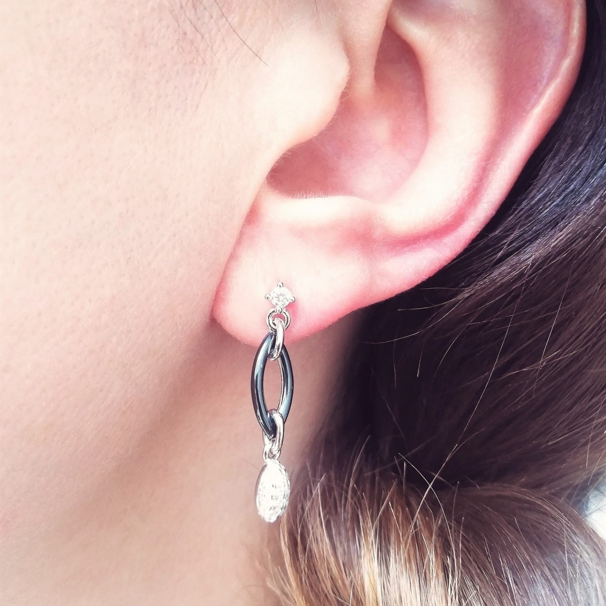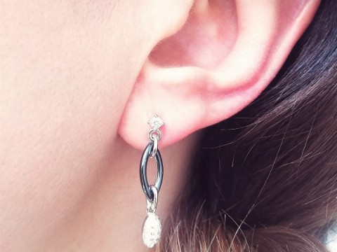 Kolczyki z ogniwem z czarnej, gładkiej ceramiki z zawieszką z rodowanego srebra próby 925. Zapinane na sztyft zdobiony oczkiem z białej cyrkonii.