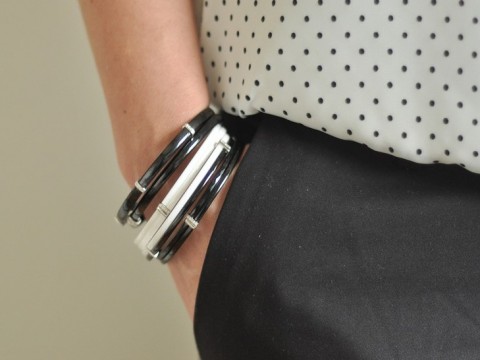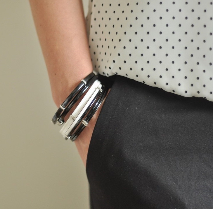 Bransoletka w kształcie koła wykonana z czarnej, gładkiej ceramiki i srebrnych elementów zdobionych białymi cyrkoniami. Uszlachetniona rodem, by dłużej zachowała jasną barwę, blask i była odporniejsza na uszkodzenia.