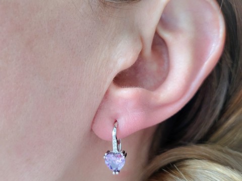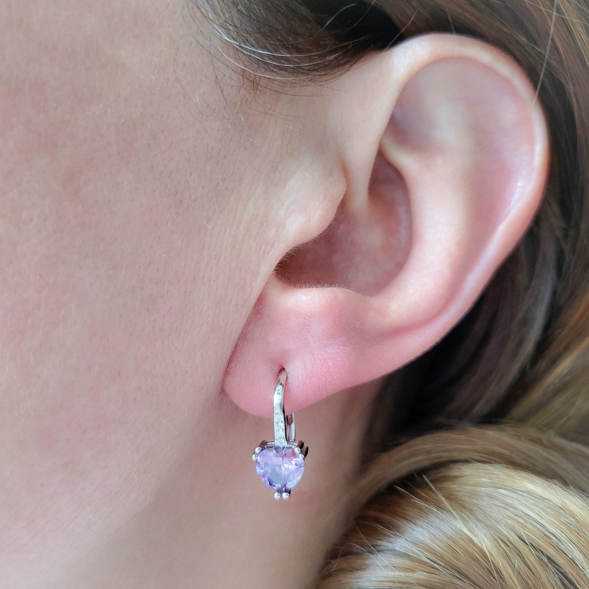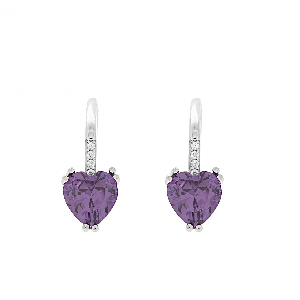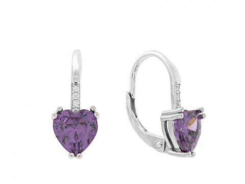Srebrne kolczyki wiszące wysadzane białymi cyrkoniami z dużą cyrkonią w kształcie serca w ametystowym kolorze. Zapinane na włoski bigiel. Uszlachetnione rodem.