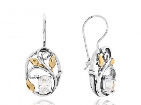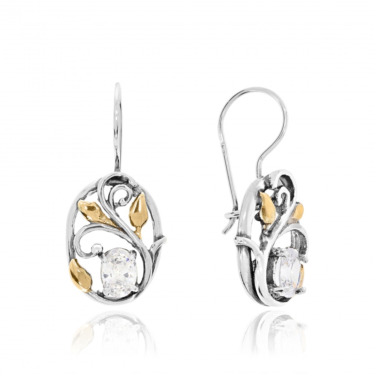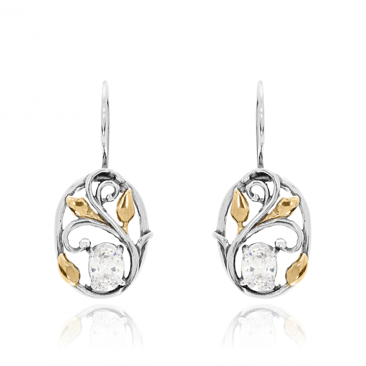 Oksydowane srebrne kolczyki z dużą cyrkonią i złoconymi listkami. Wykończone połyskiem.