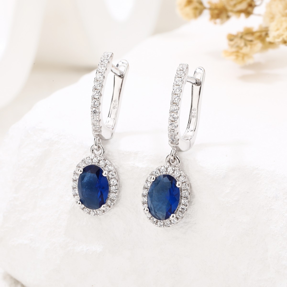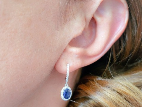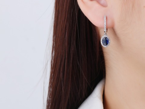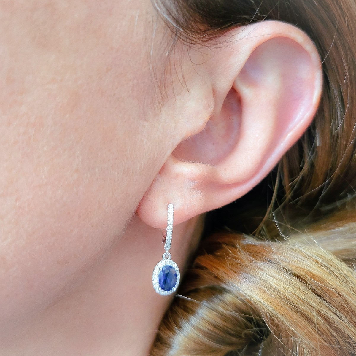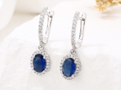 Rodowane kolczyki na angielskim zapięciu z szafirową, owalną cyrkonią otoczoną drobnymi cyrkoniami. Cyrkonie zdobią również zapięcie. Srebro wykończone wysokim połyskiem.