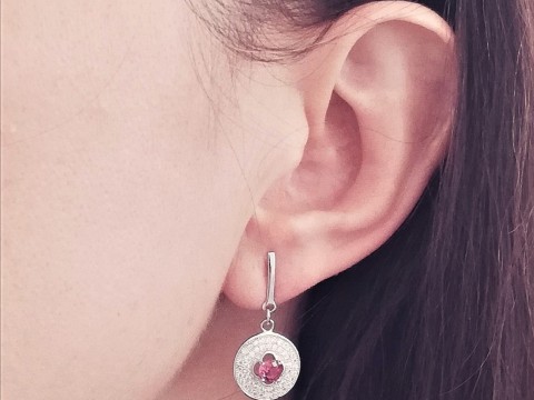 Komplet kolczyków z zawieszką wykonany z najwyższej jakości srebra uszlachetnionego rodem. Zdobiony centralnie rubinową cyrkonią otoczoną dwoma okręgami białych, drobnych cyrkonii.