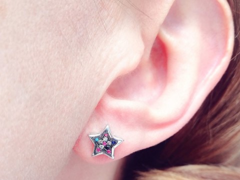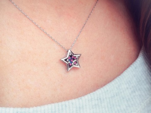 Komplet kolczyków z naszyjnikiem (łańcuszek o splocie ankier z zawieszką) z motywem gwiazdki wykonany z najwyższej jakości srebra. Zdobiony kolorowymi cyrkoniami. Gwiazdka jest trójwymiarowa, o grubości 3 mm. Naszyjnik zapinany na federing, posiada przedłużkę.