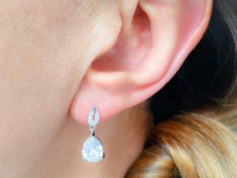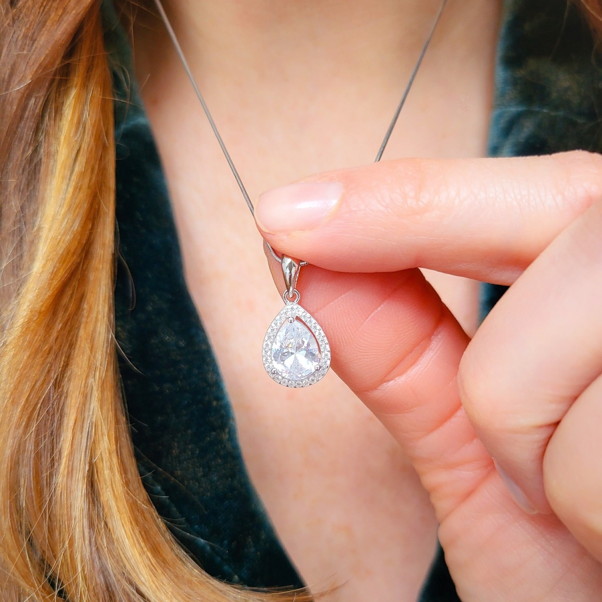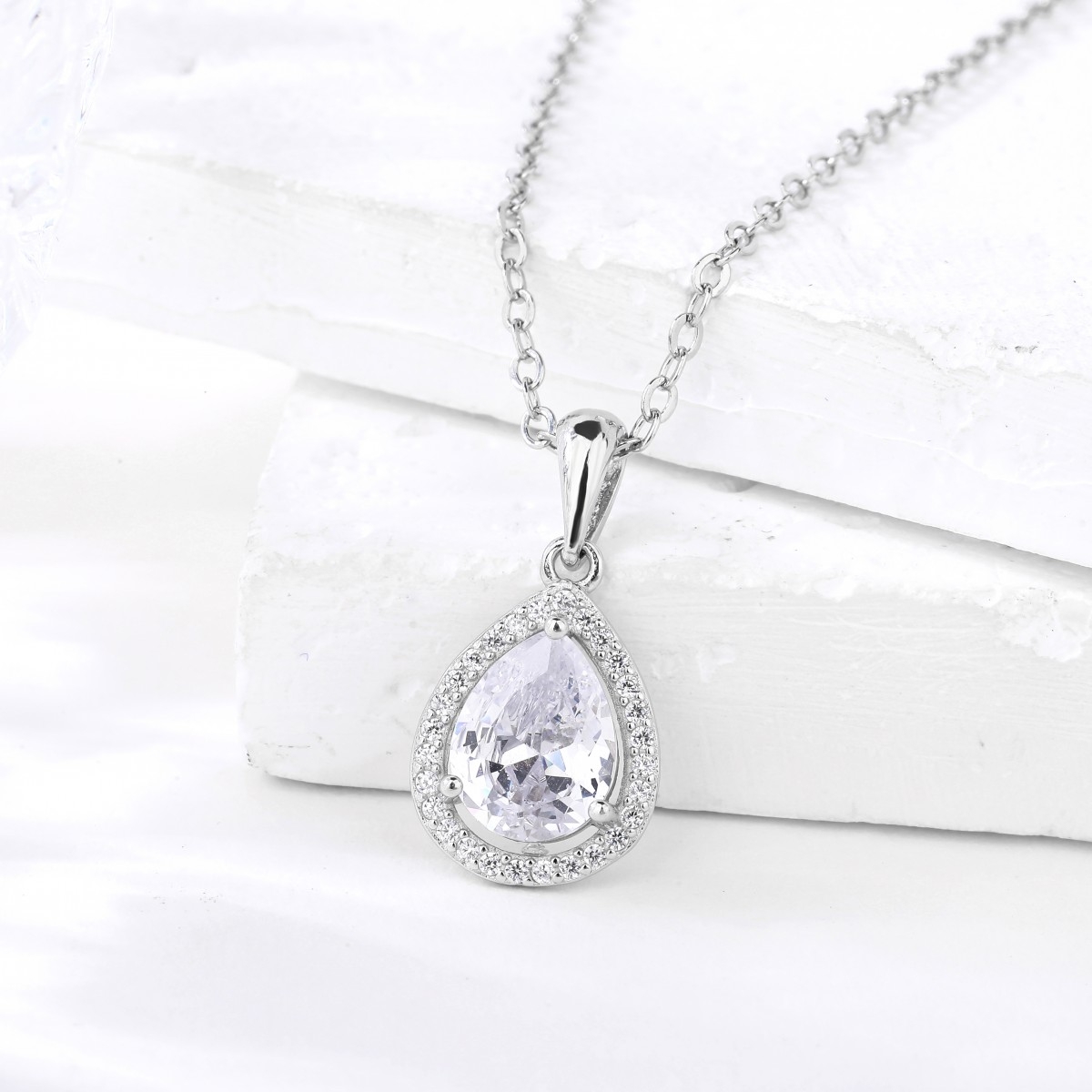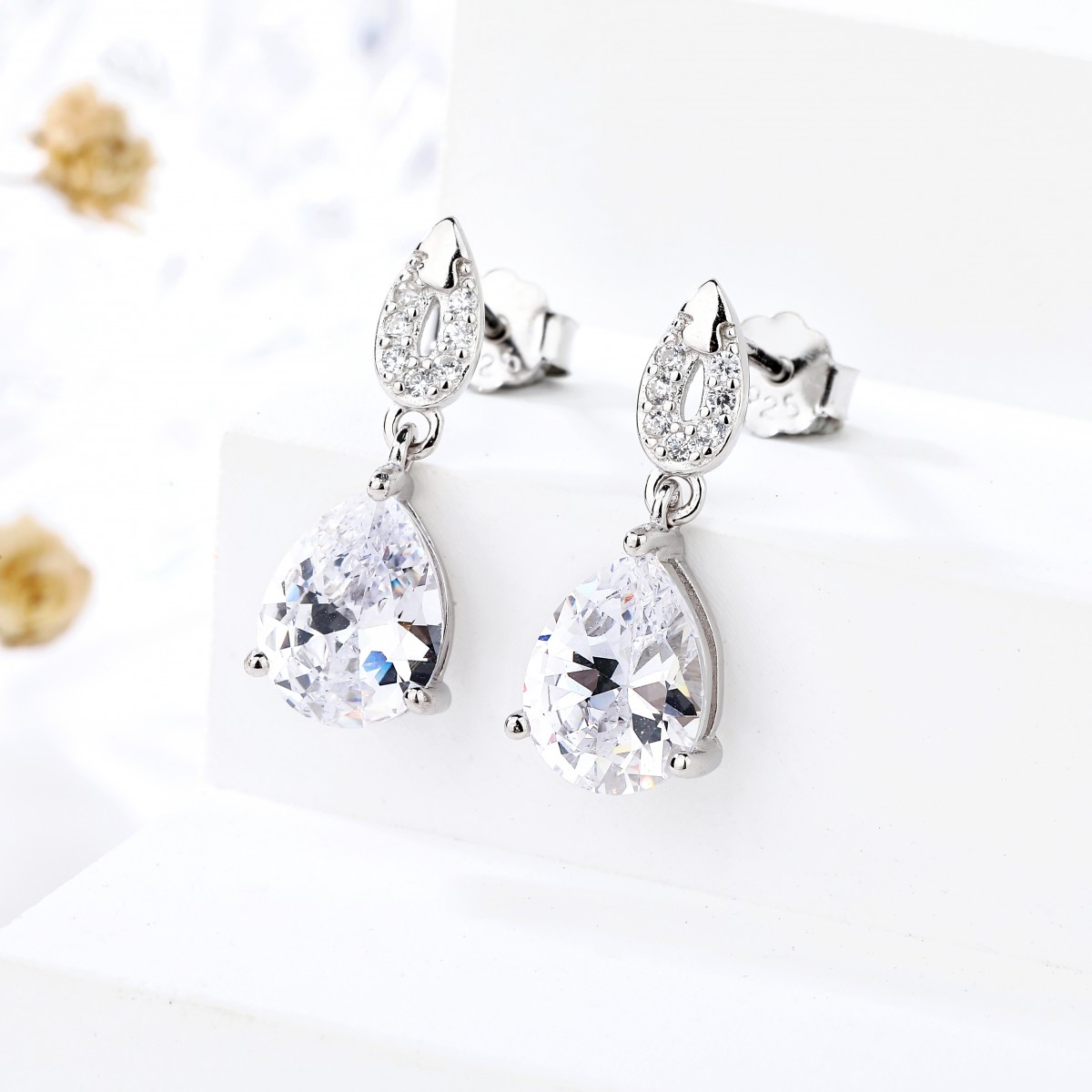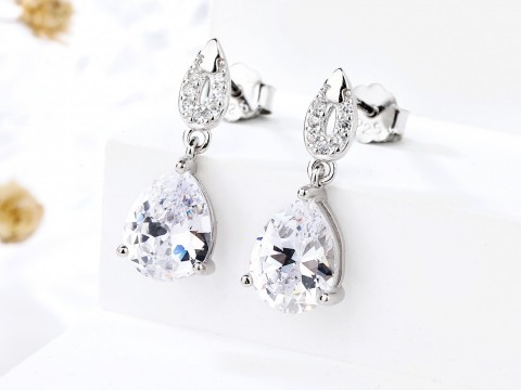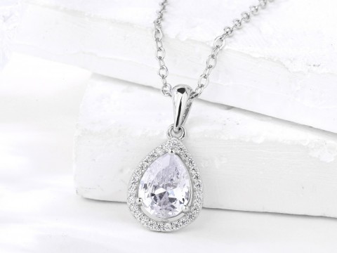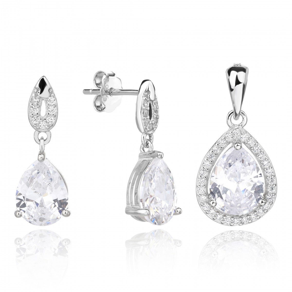 Srebrny komplet złożony z kolczyków i zawieszki w formie łezki. Kolczyki i zawieszka zdobione centralnie dużą, białą łezką fasetowanej cyrkonii umocowaną w łapkach. Biała, drobna cyrkonia na zawieszce tworzy obramowanie głównego kamienia, a na kolczykach zdobi sztyft. Srebro wykończone połyskiem i uszlachetnione rodem.