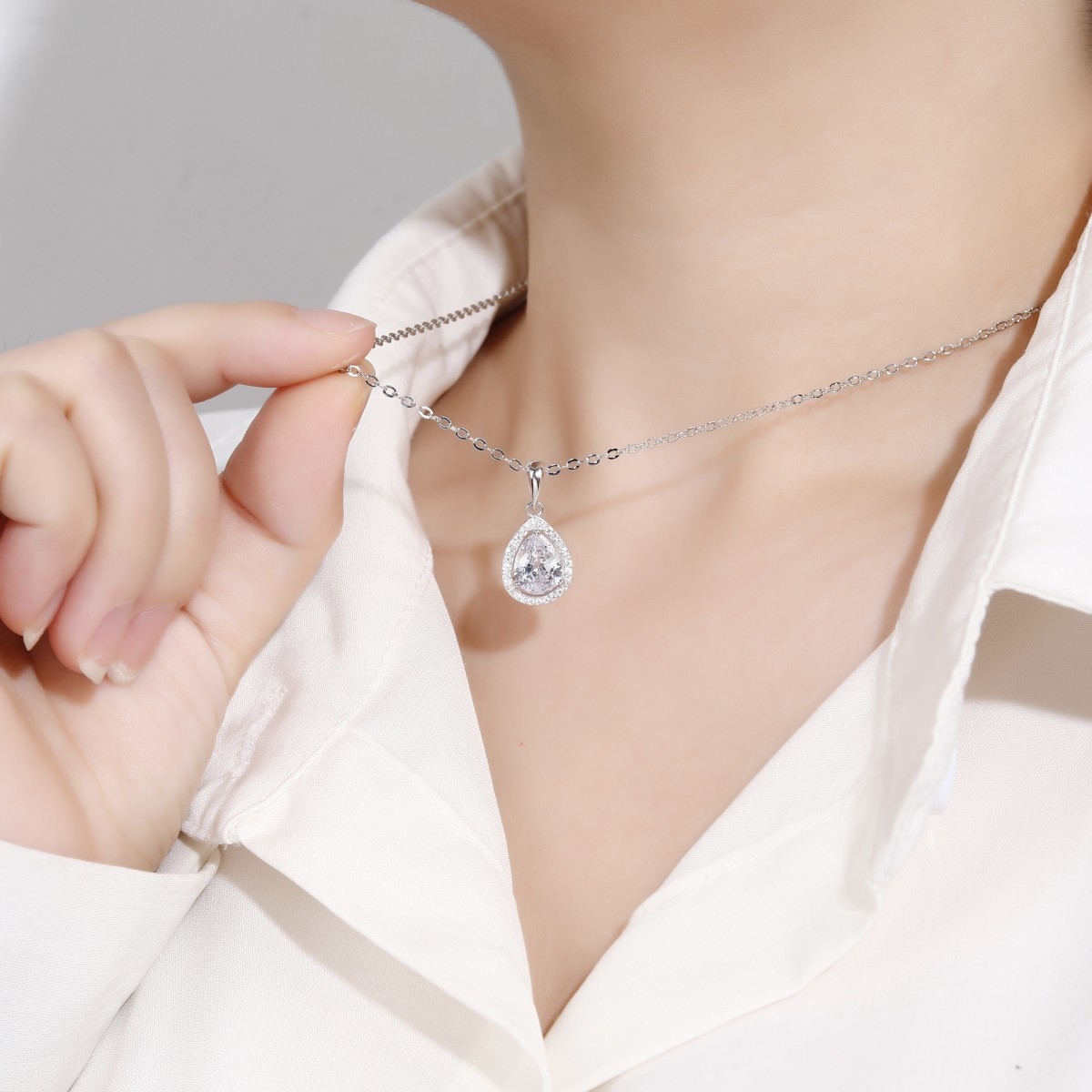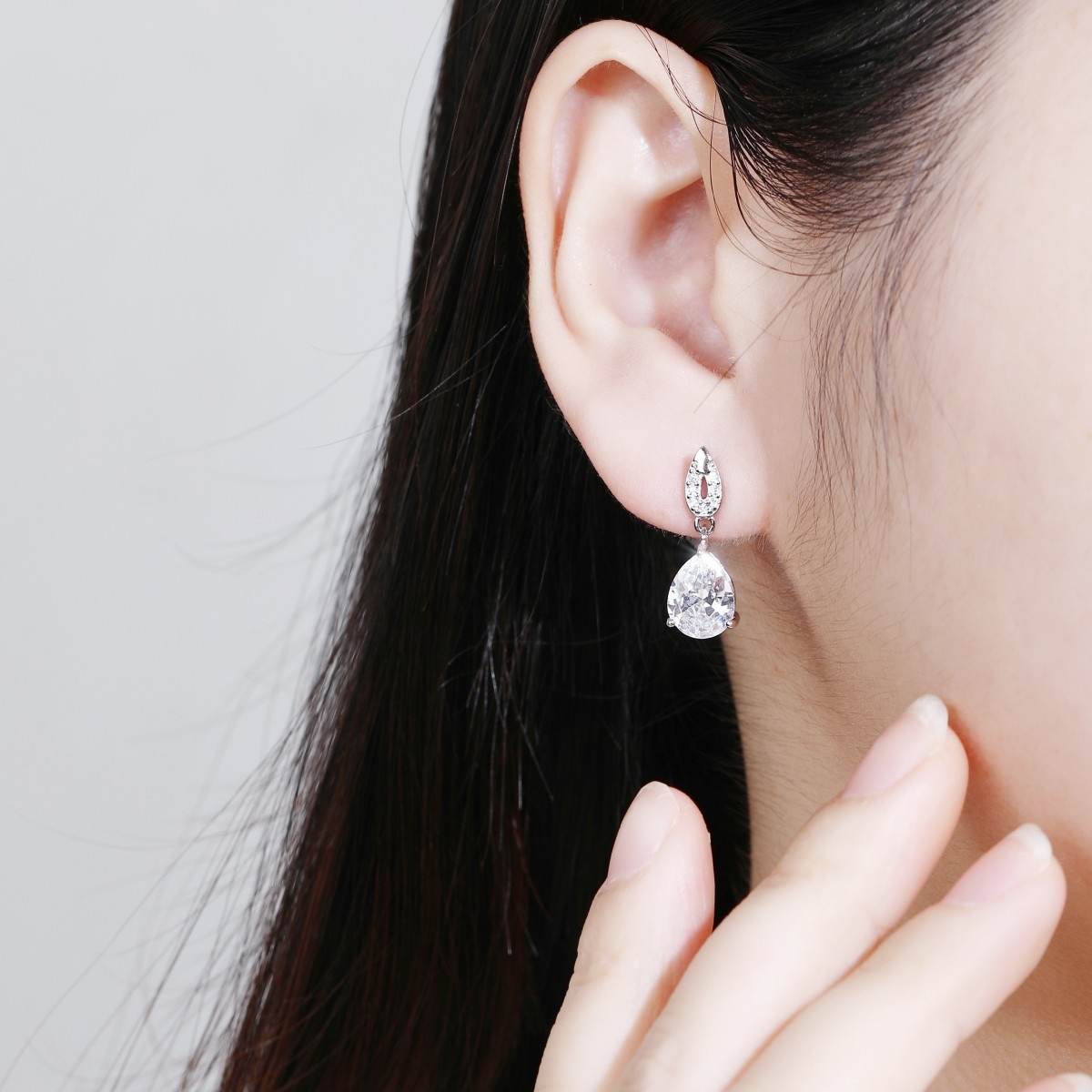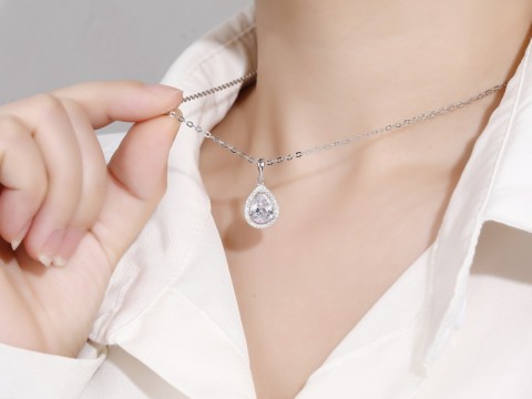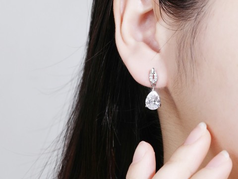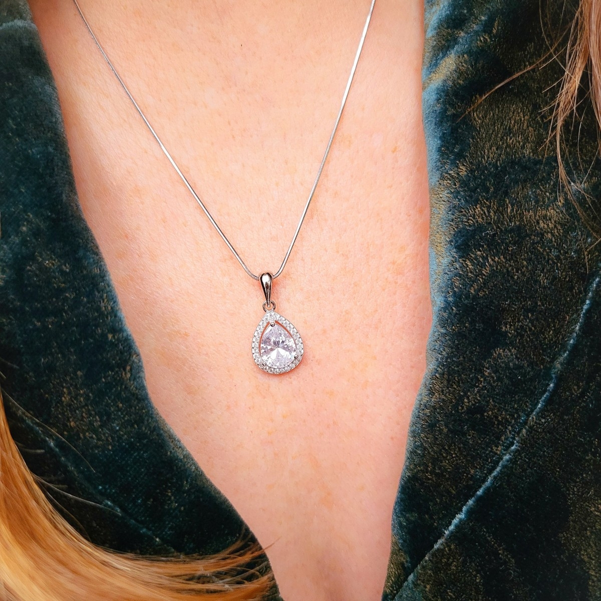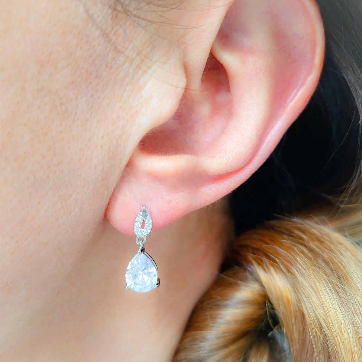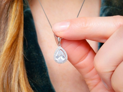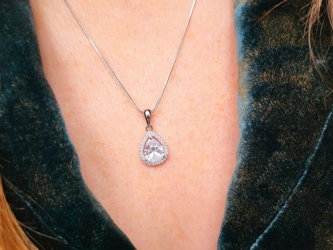 Srebrny komplet złożony z kolczyków i zawieszki w formie łezki. Kolczyki i zawieszka zdobione centralnie dużą, białą łezką fasetowanej cyrkonii umocowaną w łapkach. Biała, drobna cyrkonia na zawieszce tworzy obramowanie głównego kamienia, a na kolczykach zdobi sztyft. Srebro wykończone połyskiem i uszlachetnione rodem.