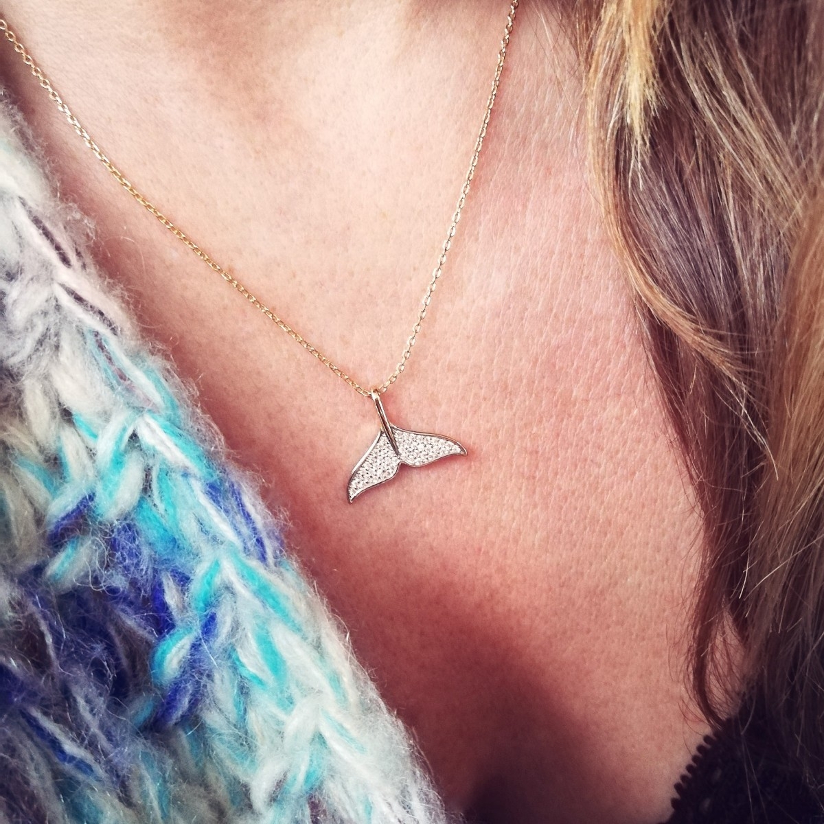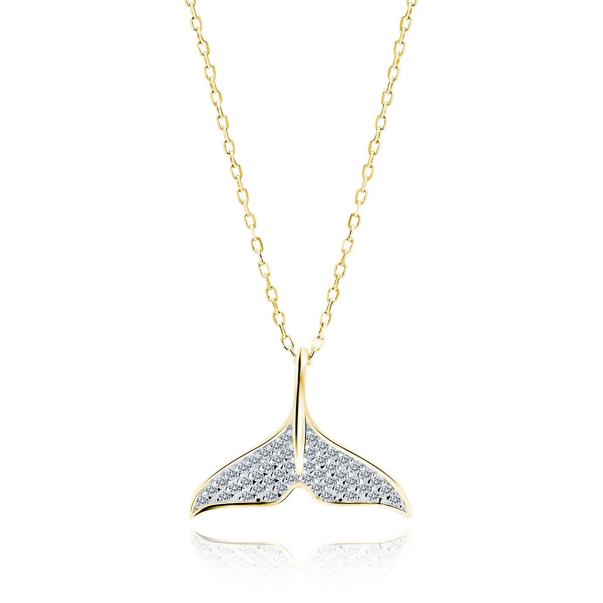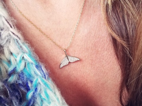 Naszyjnik wykonany z klasycznego łańcuszka o splocie ankier i zawieszki z płetwą wieloryba zdobioną cyrkoniami. Zapinany na federing.