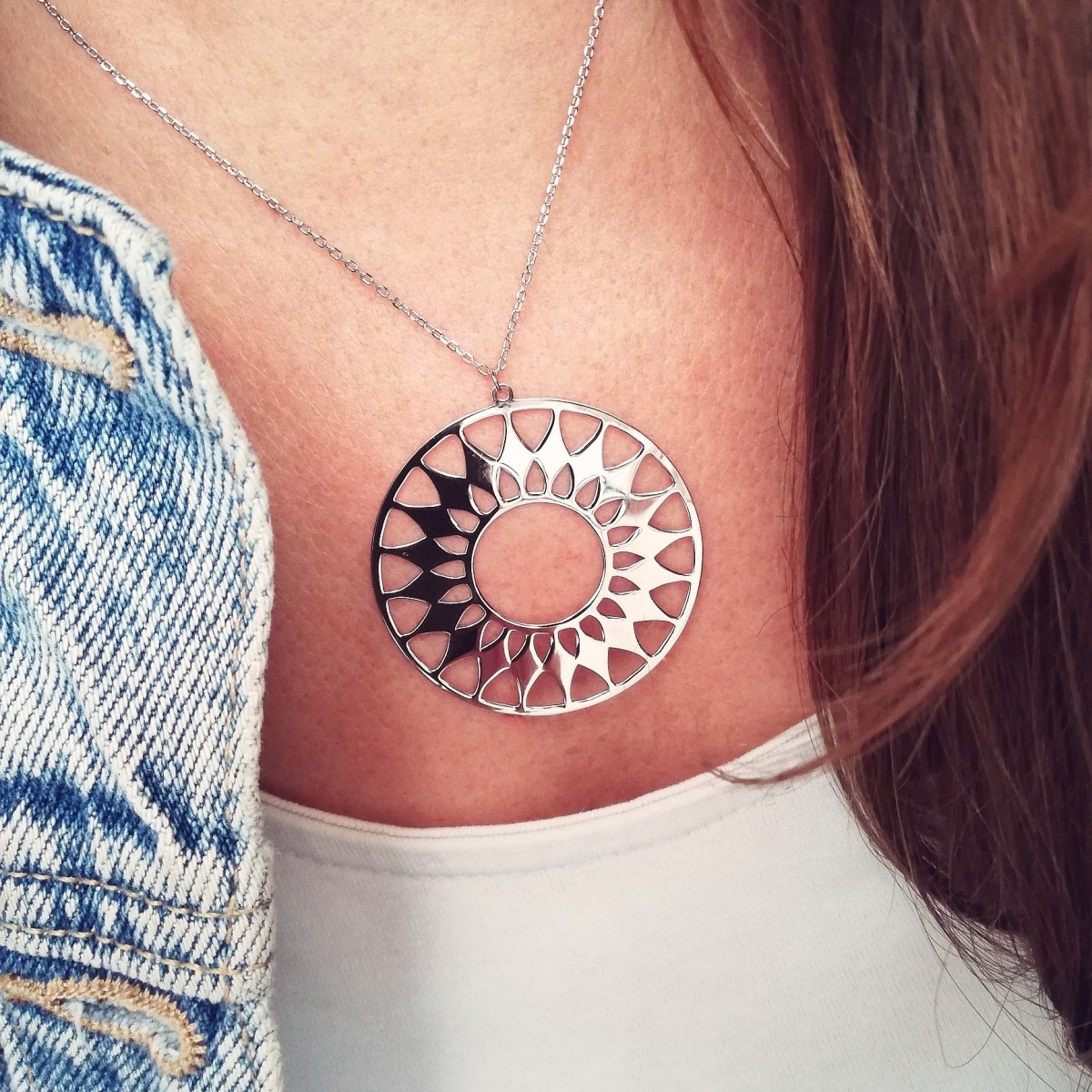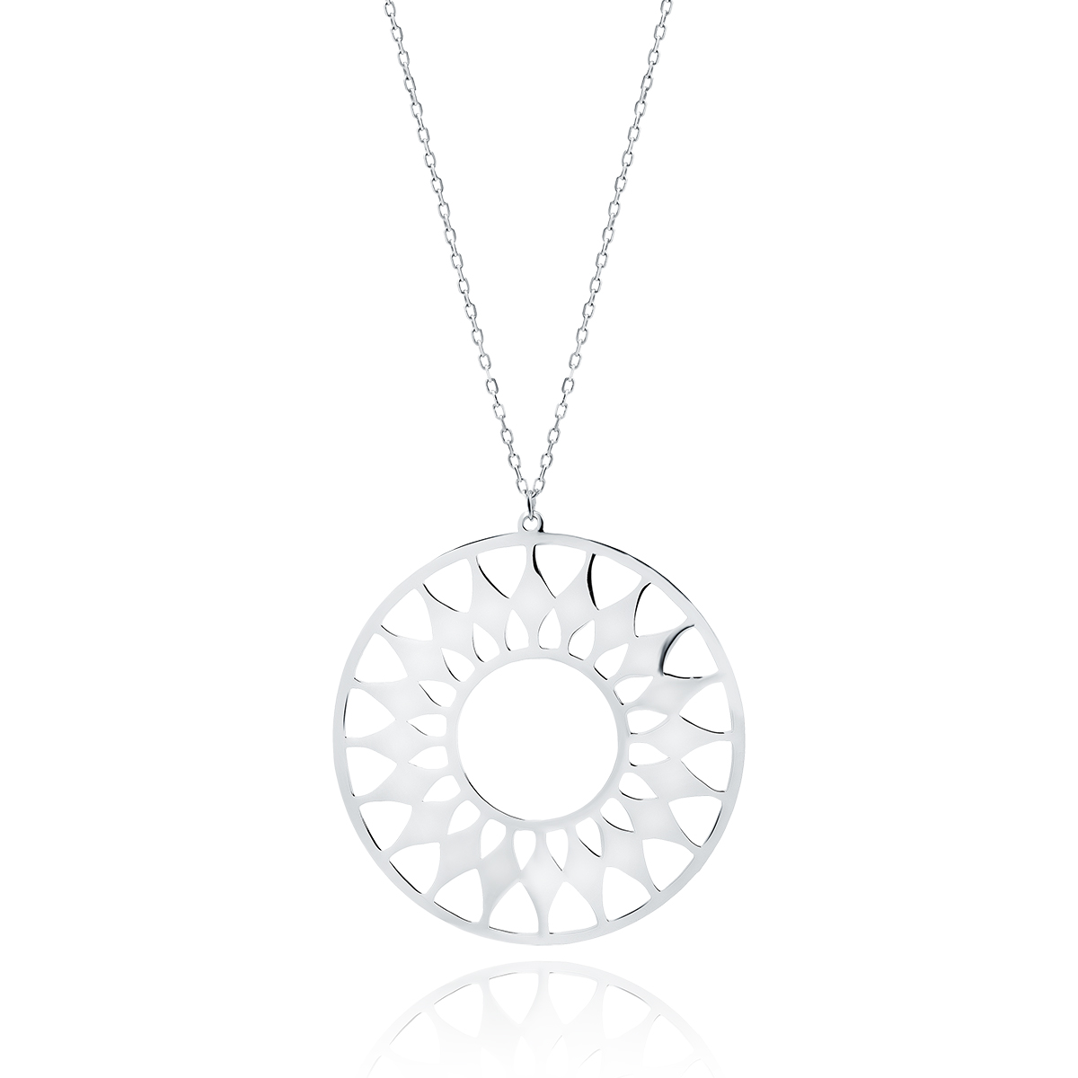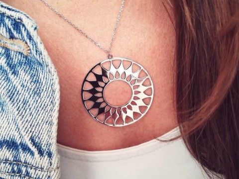 Naszyjnik wykonany z klasycznego łańcuszka o splocie ankier i okrągłej zawieszki z motywem mandali. Srebro wykończone na wysoki połysk. Naszyjnik zapinany na federing. Uszlachetniony rodem.
