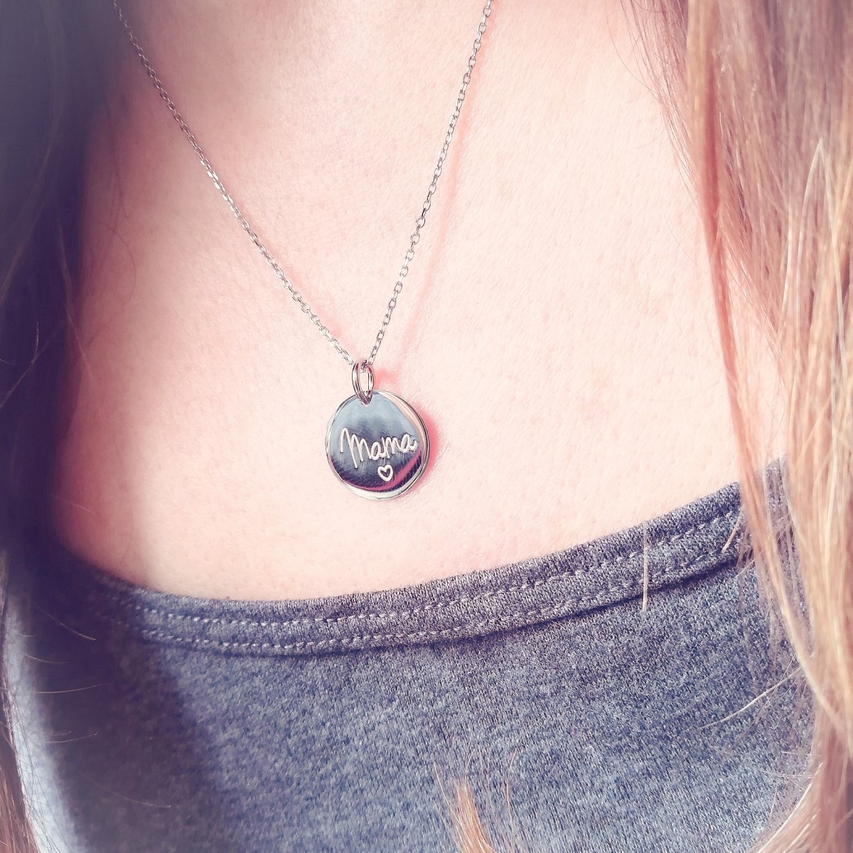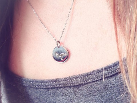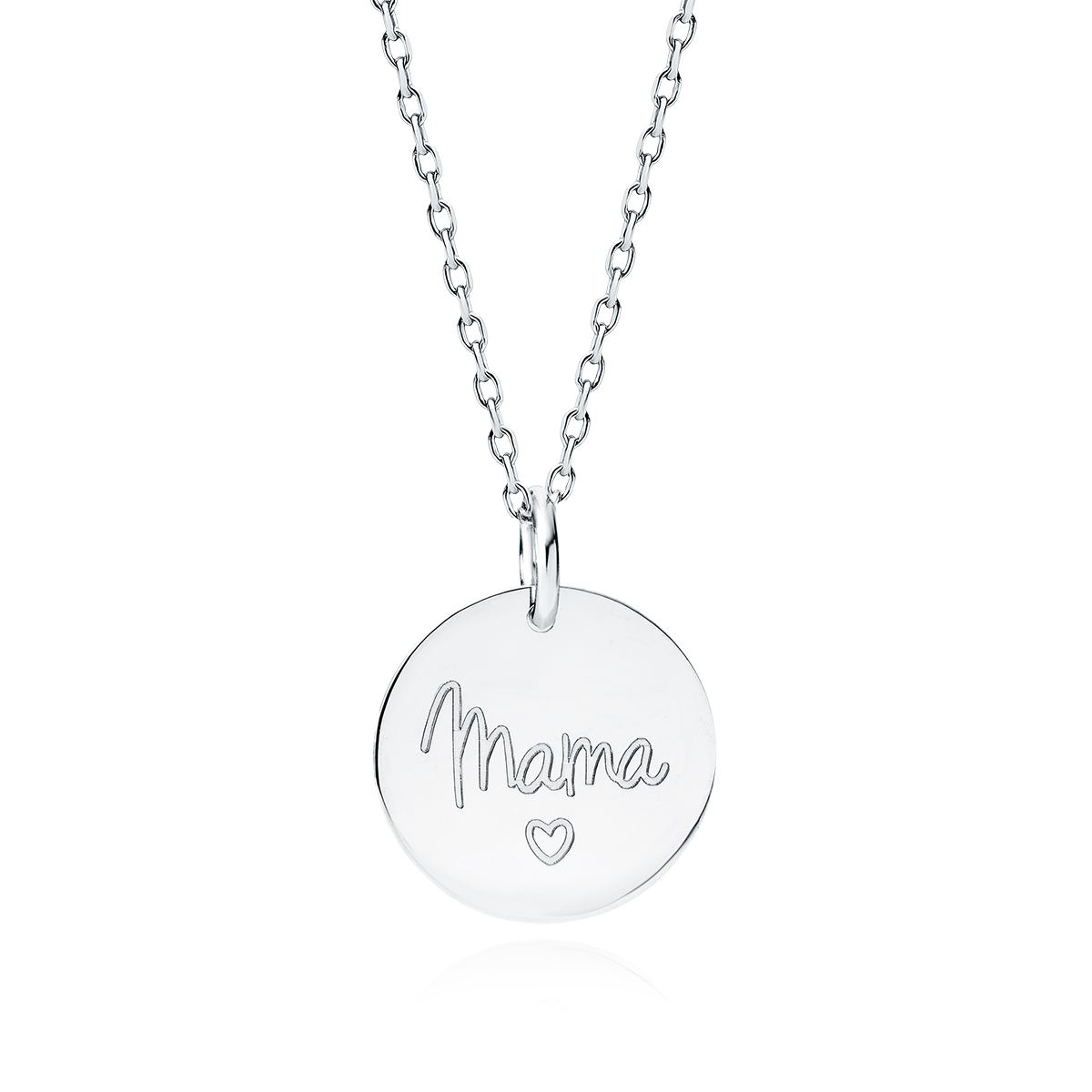 Naszyjnik wykonany z klasycznego łańcuszka o splocie ankier i okrągłej zawieszki zdobionej białym grawerem o treści MAMA i małym serduszkiem. Srebro wykończone na wysoki połysk. Naszyjnik zapinany na federing. Posiada przedłużkę.