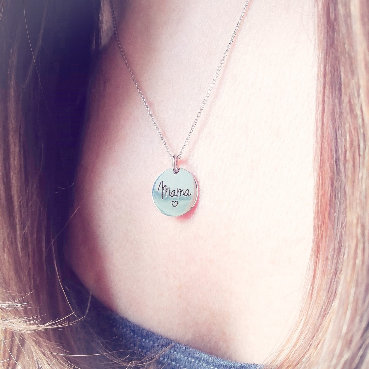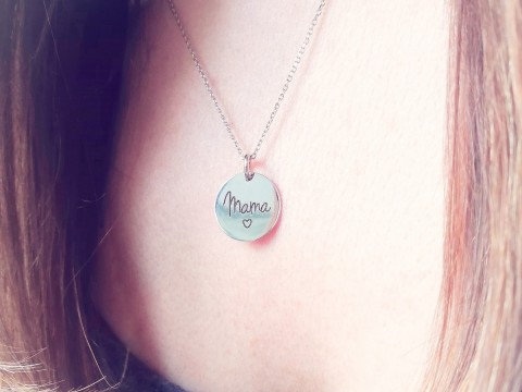 Naszyjnik wykonany z klasycznego łańcuszka o splocie ankier i okrągłej zawieszki zdobionej czarnym grawerem o treści MAMA i małym serduszkiem. Srebro wykończone na wysoki połysk. Naszyjnik zapinany na federing. Posiada przedłużkę.