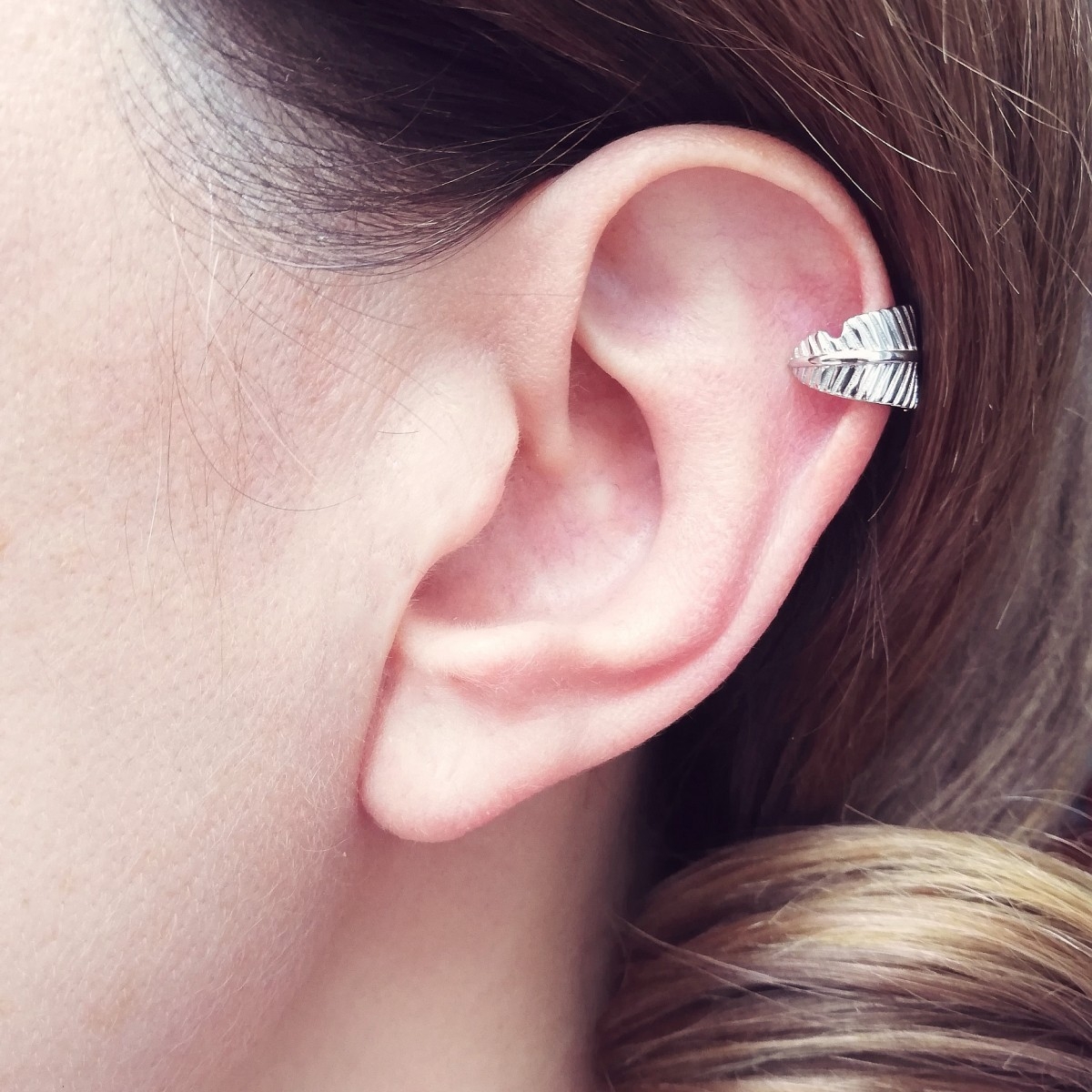 Kolczyk zaciskowy w formie nausznicy bez sztyftu. Pozwala na zdobienie ucha bez przekłuwania. Można założyć go w dowolnym miejscu małżowiny i lekko dogiąć dopasowując kolczyk do grubości płatka. Model z motywem listka o powierzchni jednostronnie fakturowanej. Srebro wykończone połyskiem i uszlachetnionej rodem. Oferta dotyczy 1 szt.