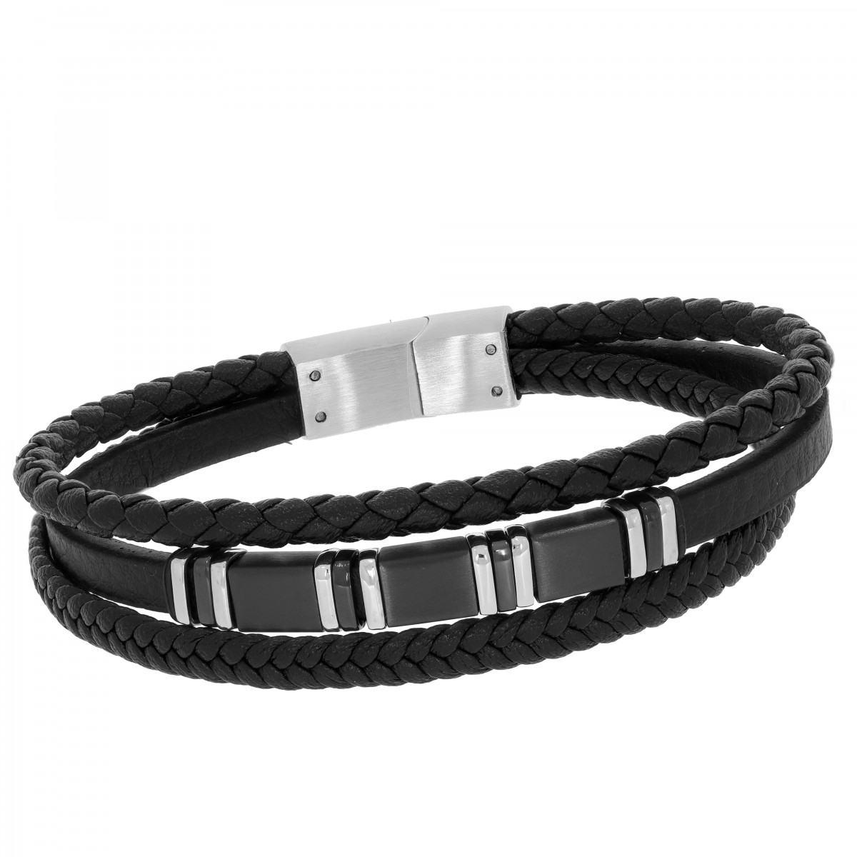 Bransoletka ze skóry ekologicznej i stali. Wykonana jest z trzech pasków oplatającego nadgarstek. Składa się z plecionej (2 szt) i gładkiej (1 szt) skóry oraz zdobnego elementu stalowego. Zapięcie magnetyczne. Kolor czarny.