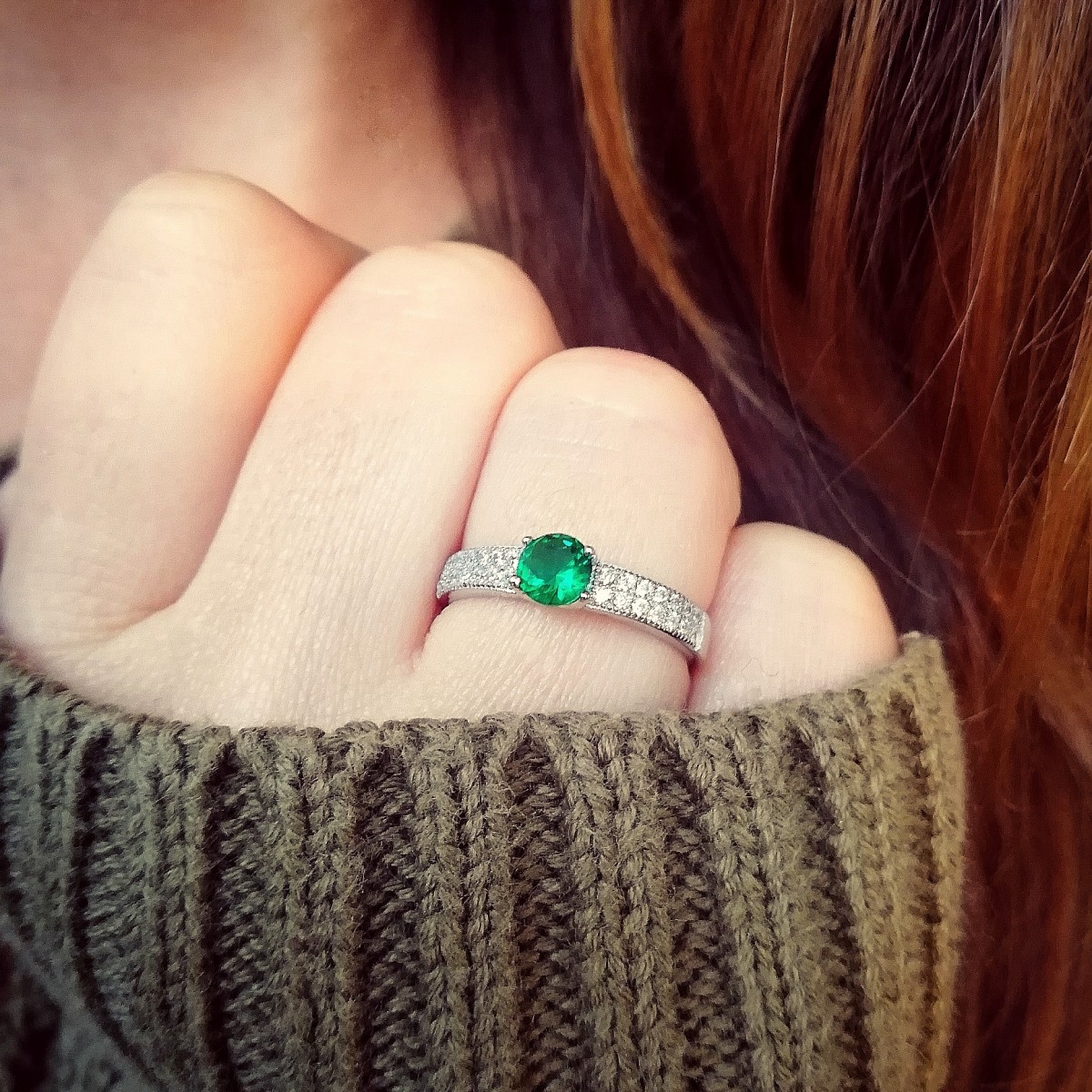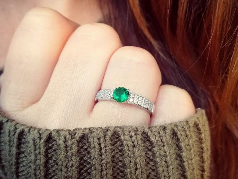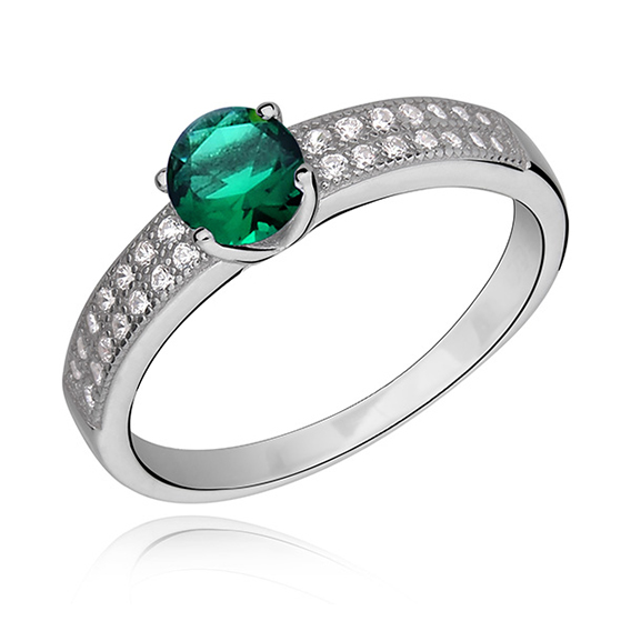 Pierścionek zdobiony centralnie oczkiem z cyrkonii w kolorze szmaragdowym oraz dwoma rzędami białych drobnych cyrkonii. Wykonany ze srebra uszlachetnionego rodem.