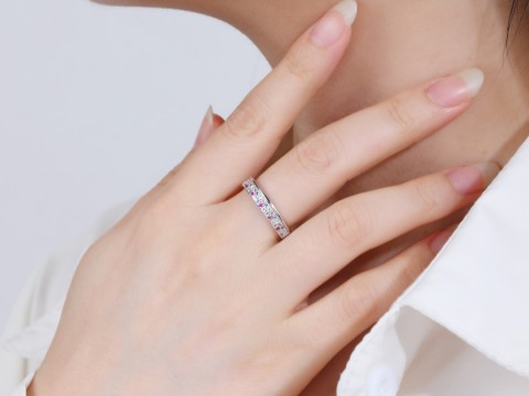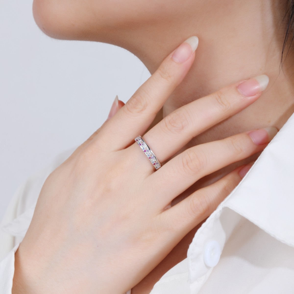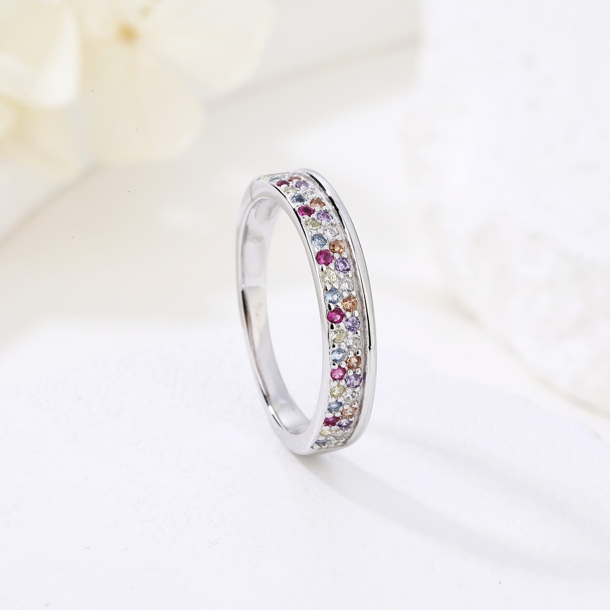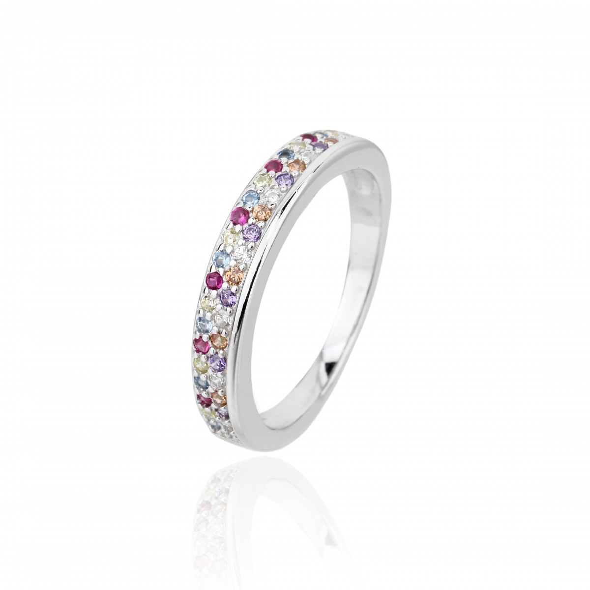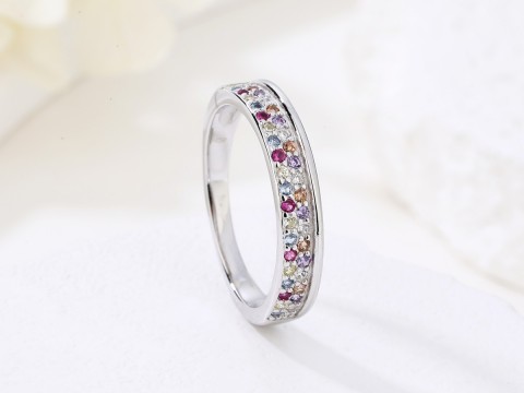Rodowany pierścionek w formie obrączki zdobiony dwoma rzędami drobnej, wielokolorowej cyrkonii. Wykończony połyskiem.