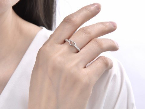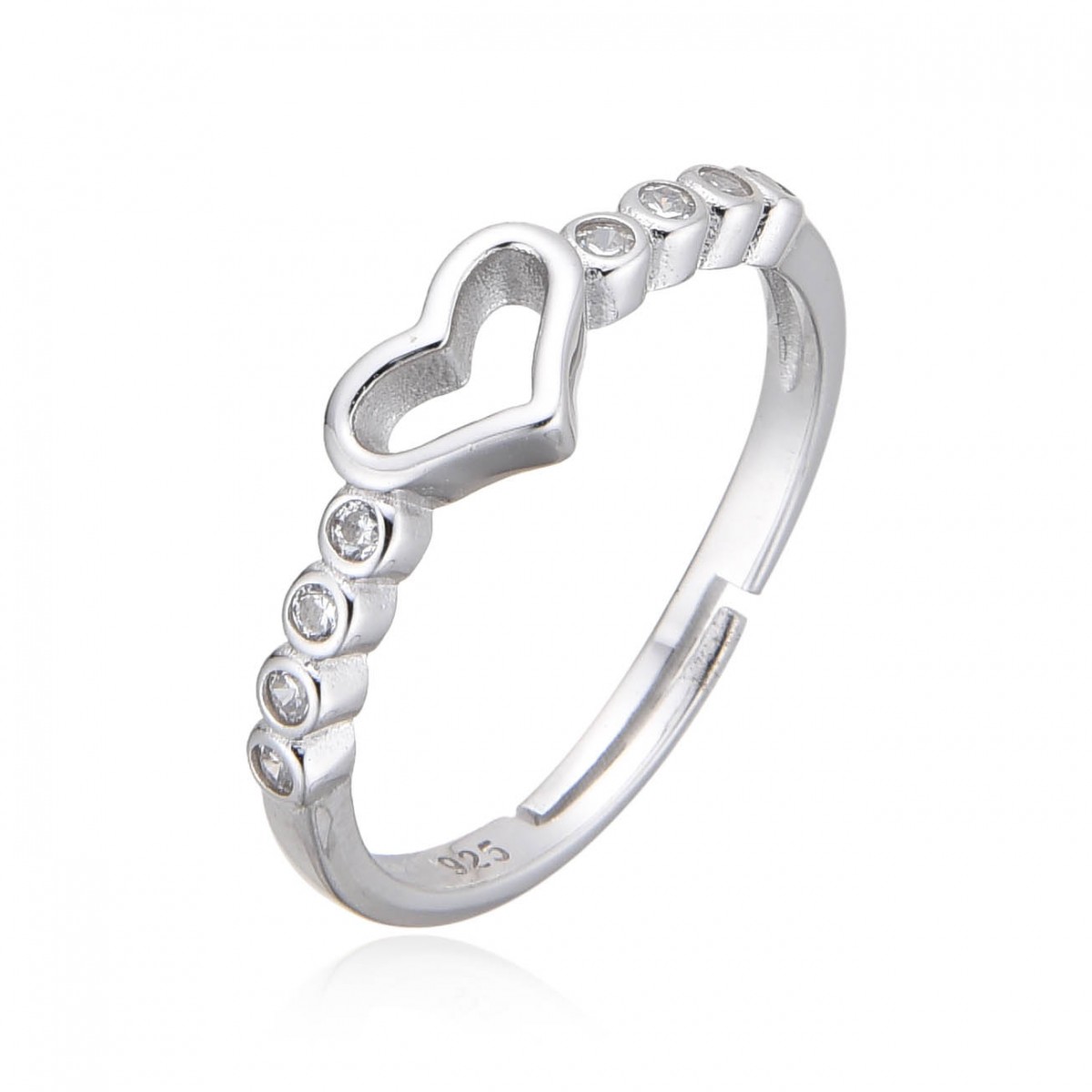 Rodowany pierścionek z ażurowym serduszkiem i okrągłymi cyrkoniami. Model otwarty, z możliwością delikatnej regulacji.