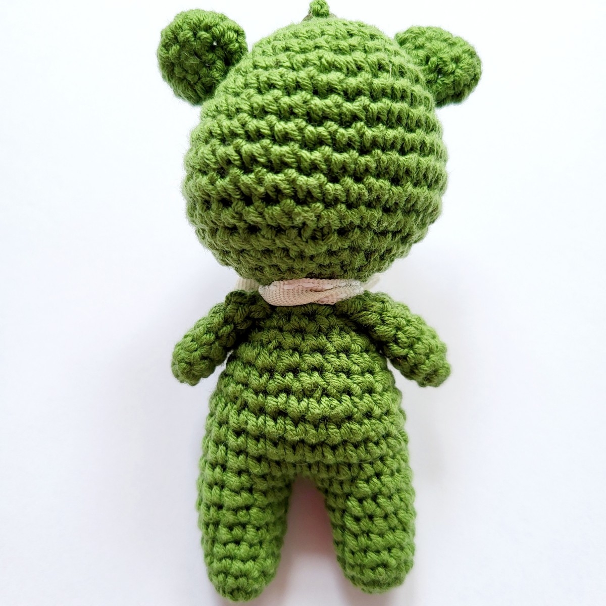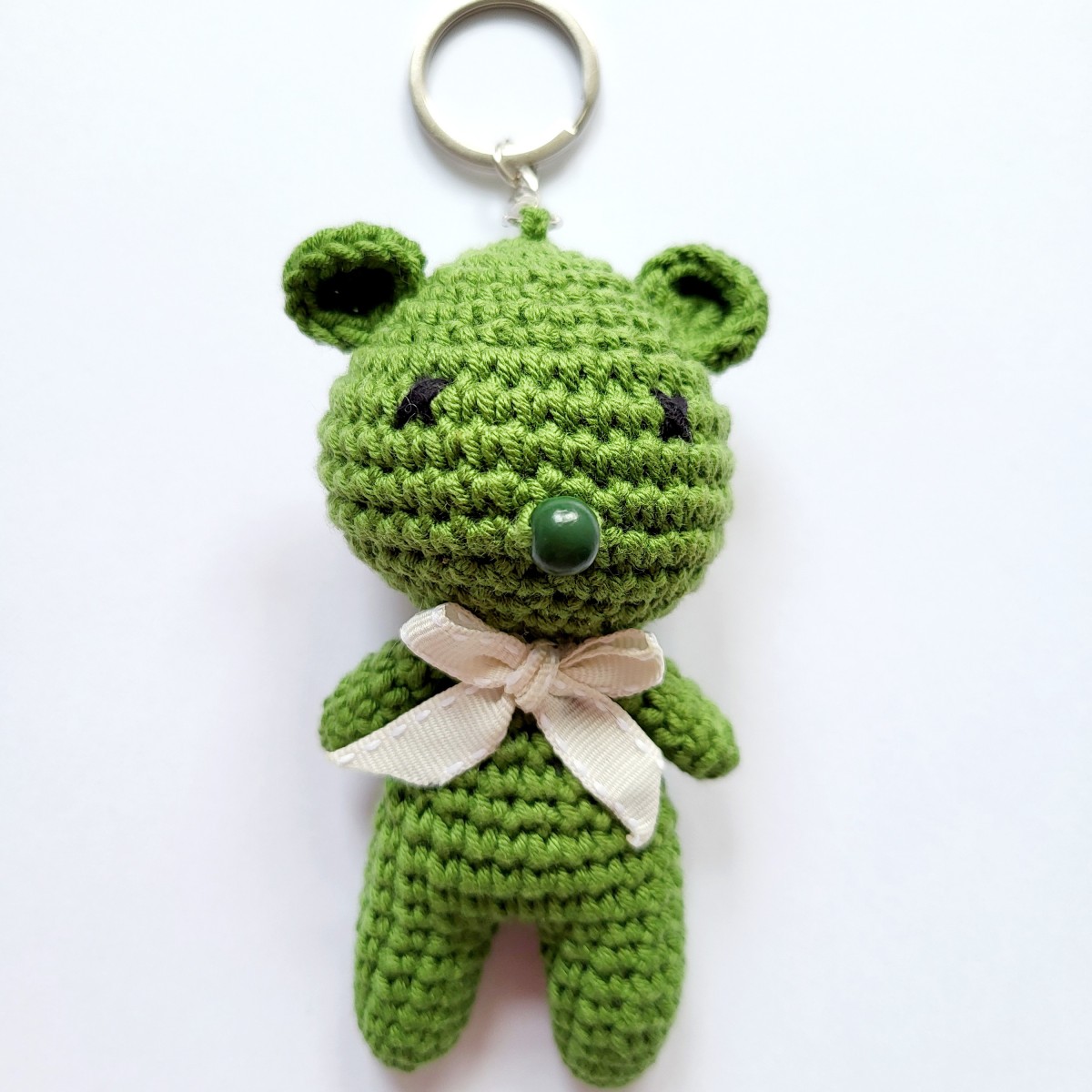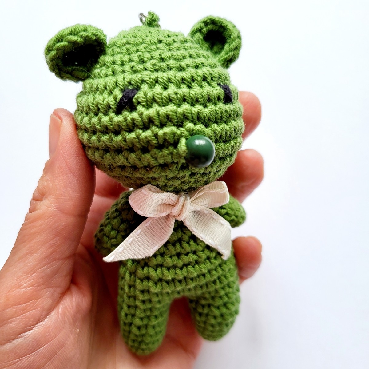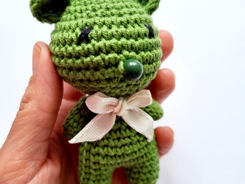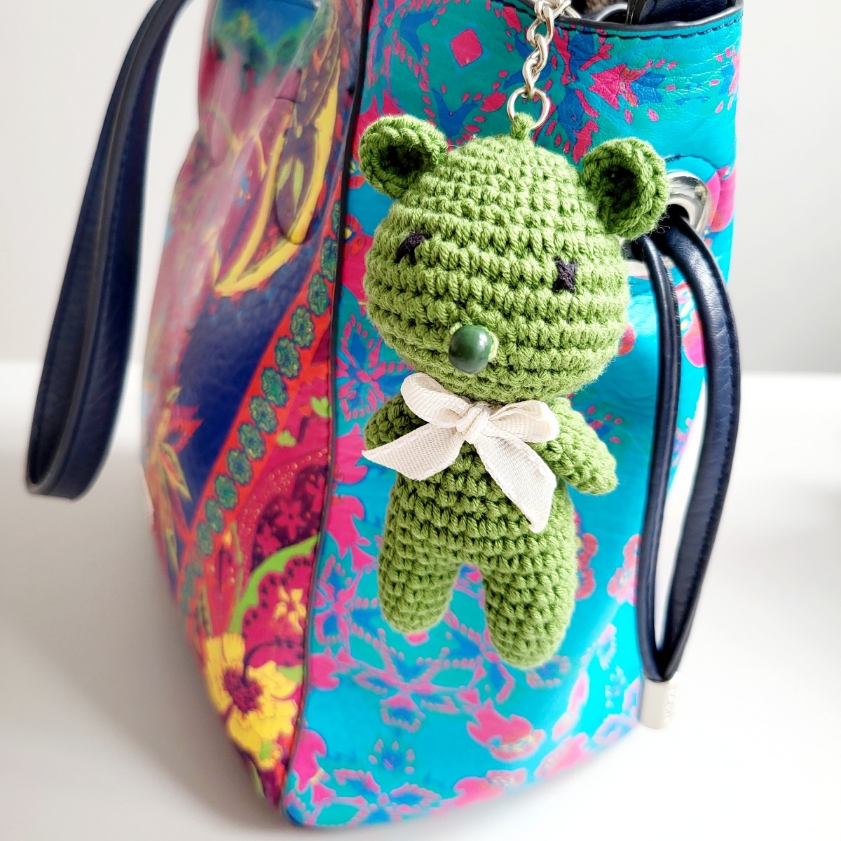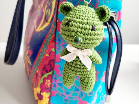 Breloczek z ręcznie wykonaną zawieszką w formie misia. Miękki, sympatyczny miś w kolorze zielonym z haftowanymi oczkami, noskiem z koralika i kokardką. Wydziergany szydełkiem z włóczki w nasyconym kolorze, wypełniony poliestrem. Można prać w temperaturze 30 stopni. Produkt polski.