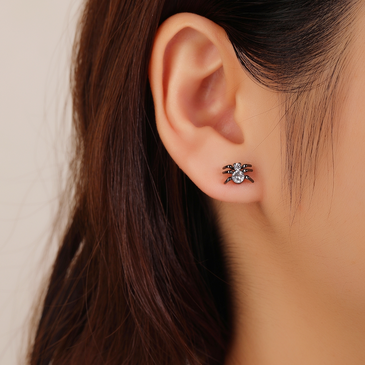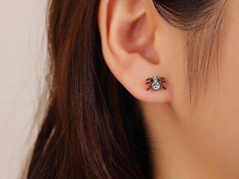 Rodowane kolczyki z motywem pająka zdobione białymi cyrkoniami. Uszlachetnione czarnym rodowaniem. Wykończone połyskiem.