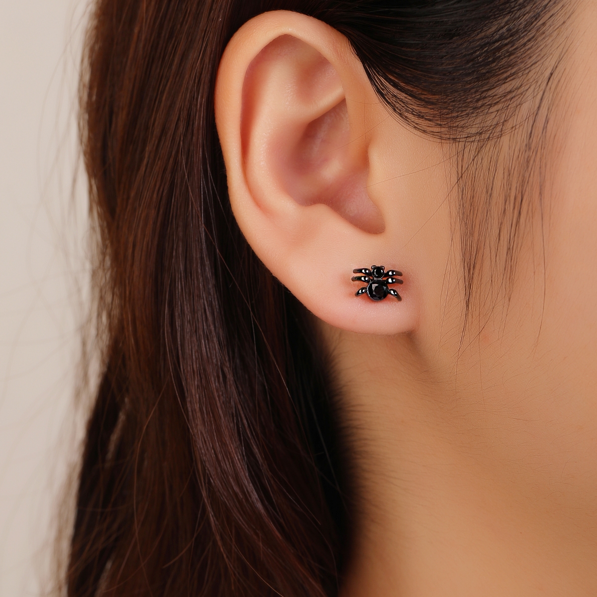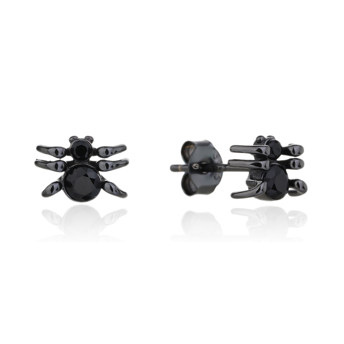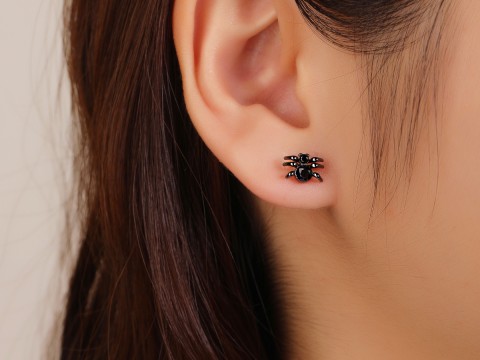 Rodowane kolczyki z motywem pająka zdobione czarnymi cyrkoniami. Uszlachetnione czarnym rodowaniem. Wykończone połyskiem.