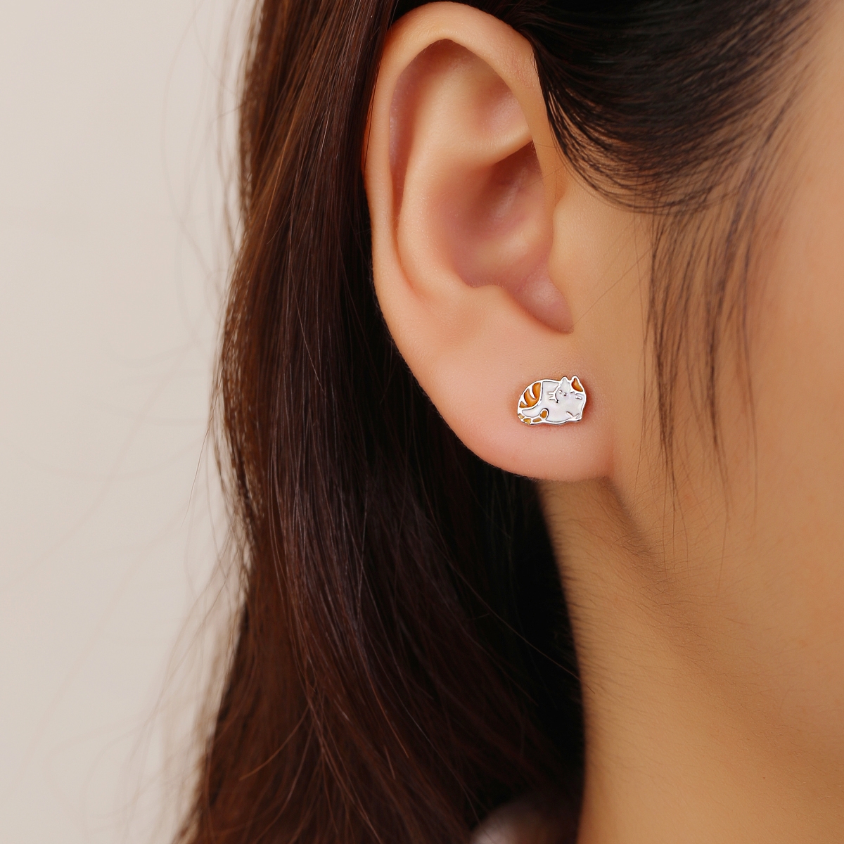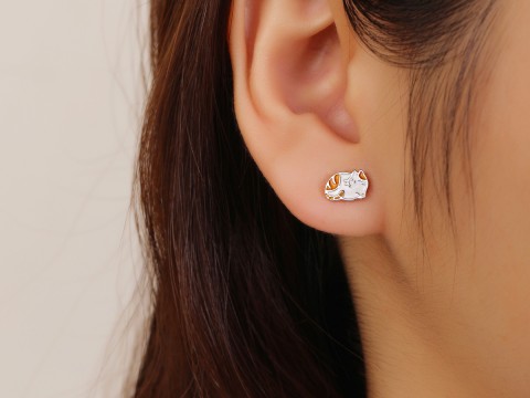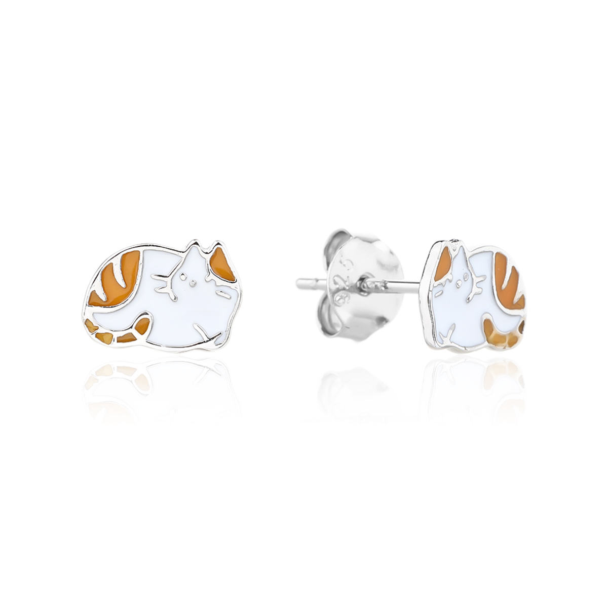 Kolczyki z motywem biało-rudego kotka. Zdobione emalią. Uszlachetnione rodem.