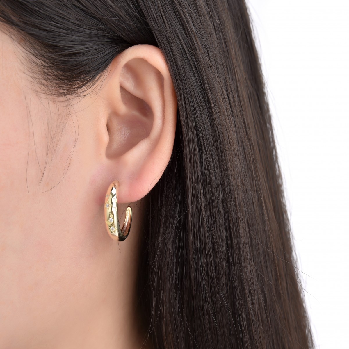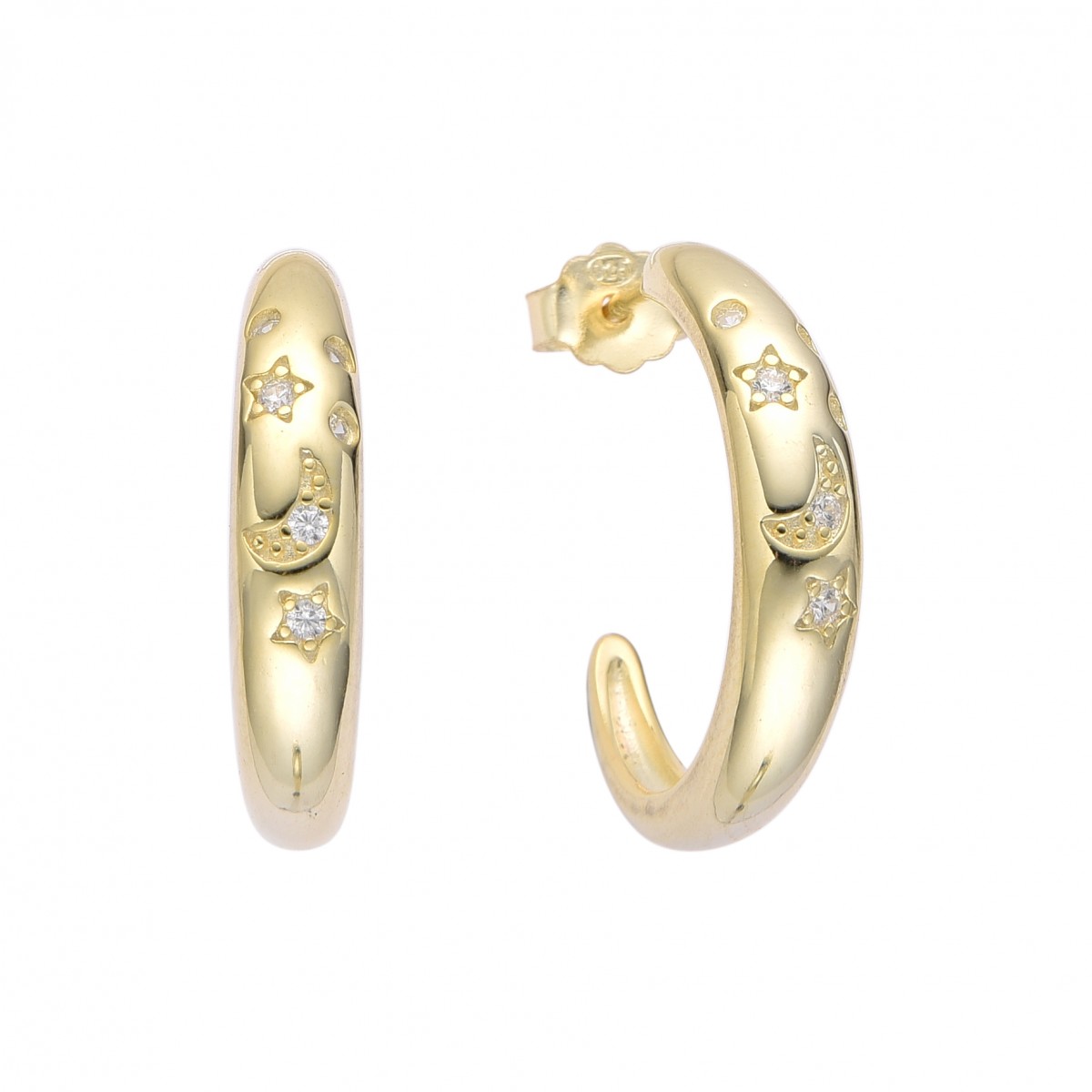 Półokrągłe kolczyki z motywem księżyca i gwiazd. Zdobione cyrkoniami. Wykończone wysokim połyskiem.