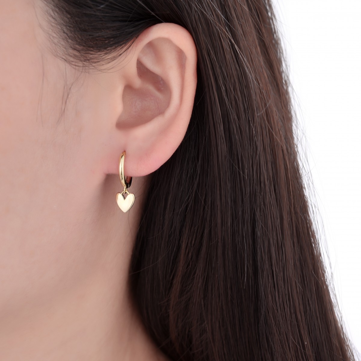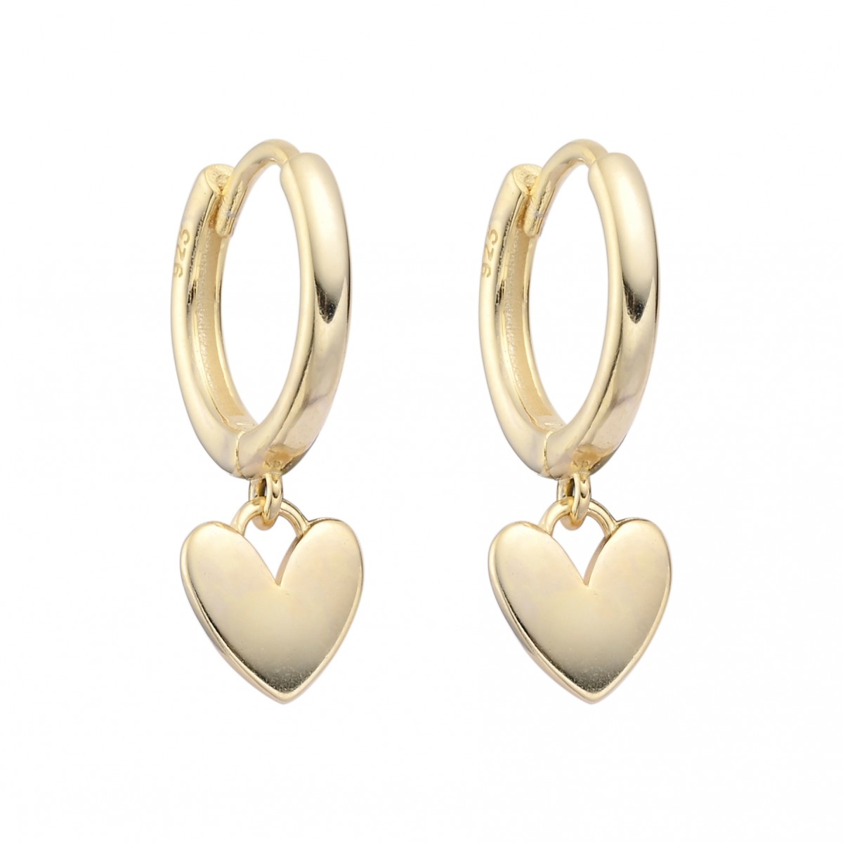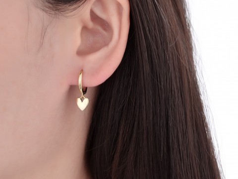 Złocone kolczyki w formie małych kreolek zdobione zawieszką w kształcie serduszka. Wykończone połyskiem, zapinane na zatrzask.