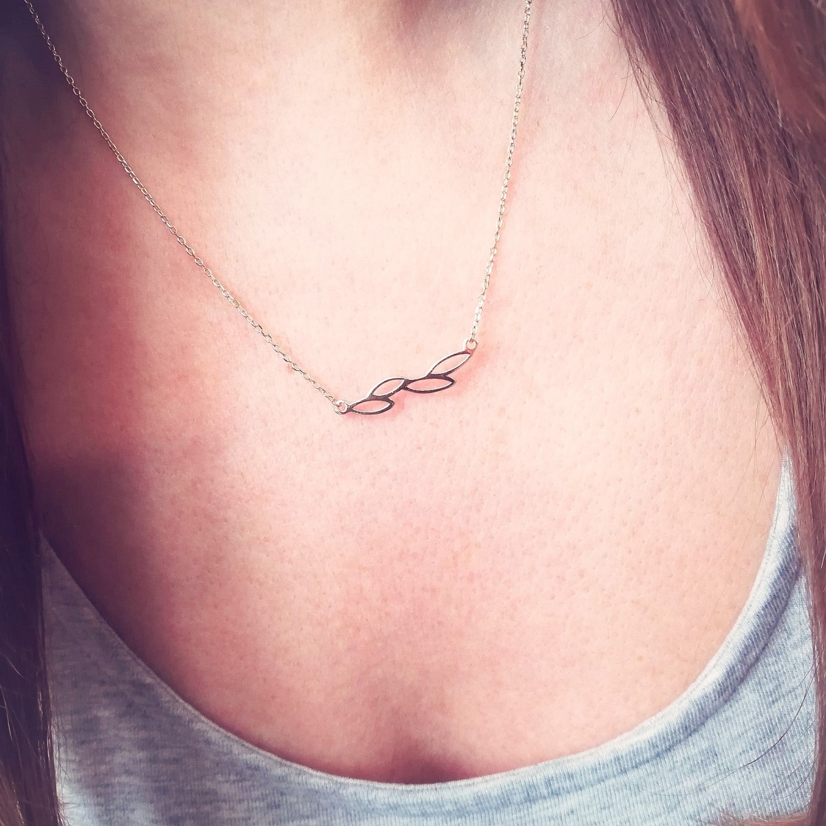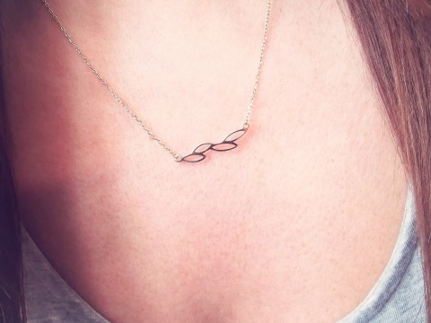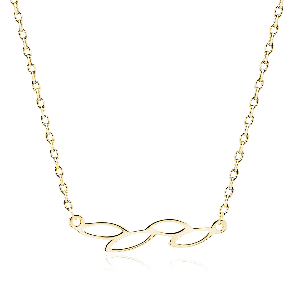 Naszyjnik wykonany z klasycznego łańcuszka o splocie ankier i ozdobnego motywu gałązki z listkami. Wykończony połyskiem. Zapinany na federing z przedłużką.