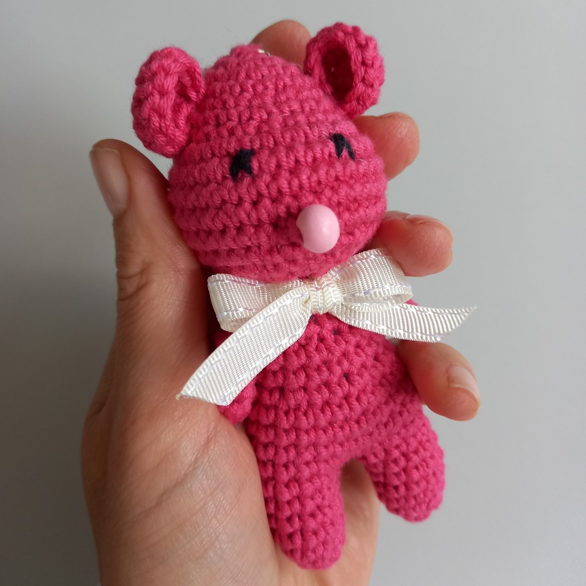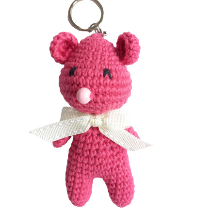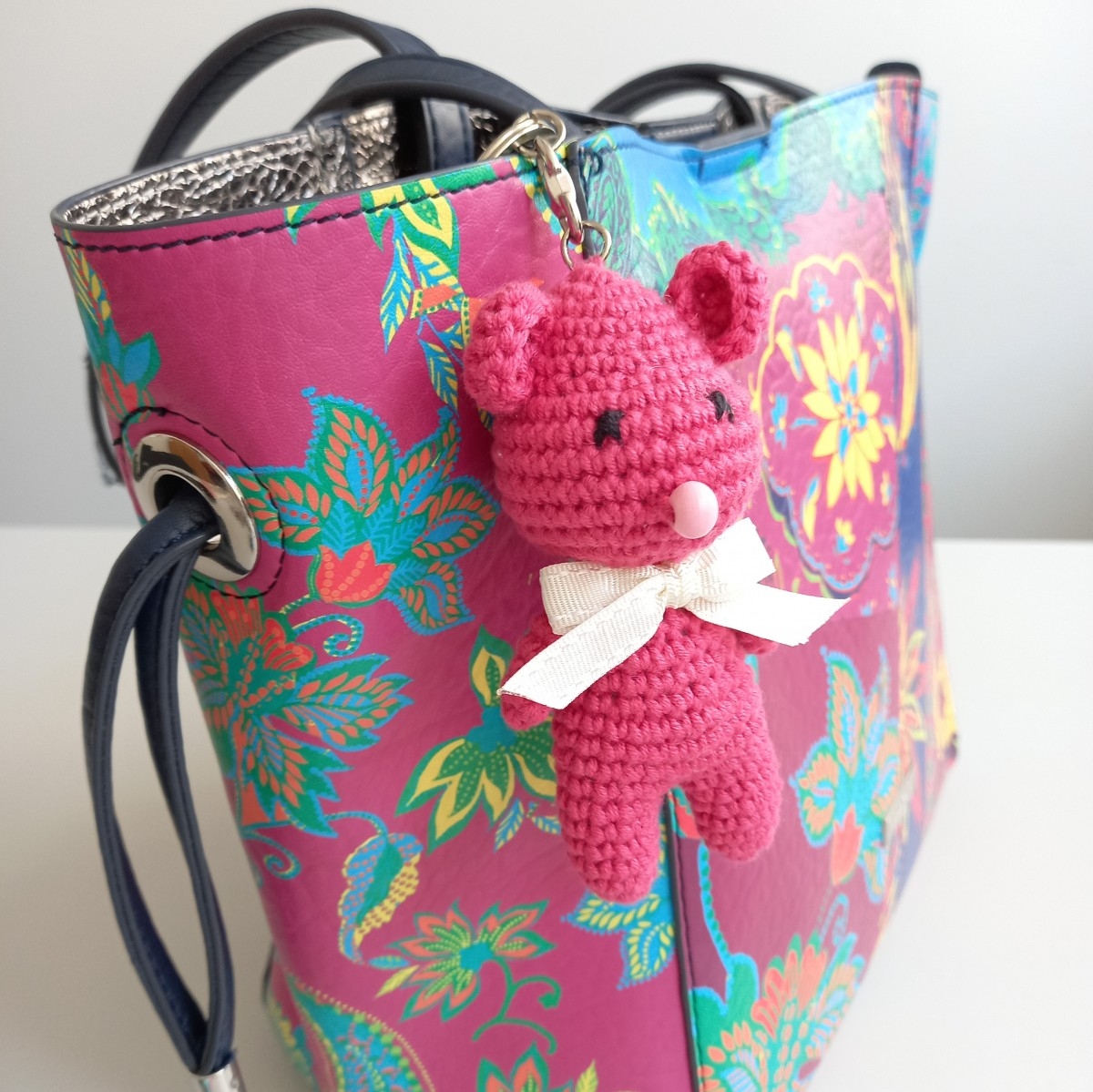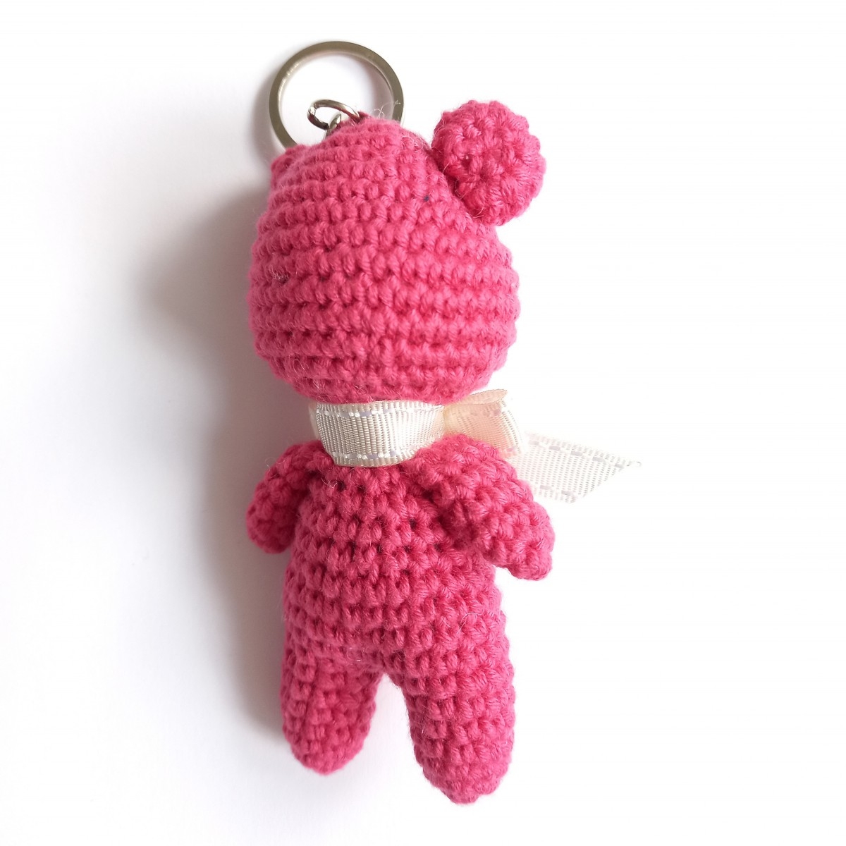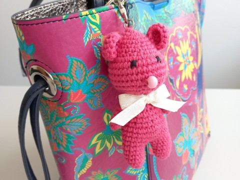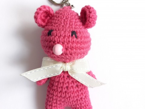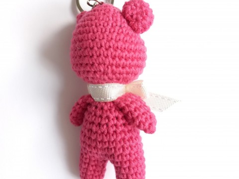 Breloczek z ręcznie wykonaną zawieszką w formie misia. Miękki, sympatyczny miś w kolorze ciemnoróżowym (piwonia) z haftowanymi oczkami, noskiem z koralika i kokardką. Wydziergany szydełkiem z włóczki w nasyconym kolorze, wypełniony poliestrem. Można prać w temperaturze 30 stopni. Produkt polski.