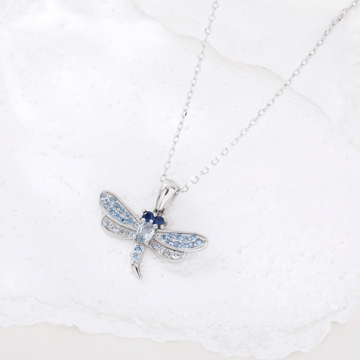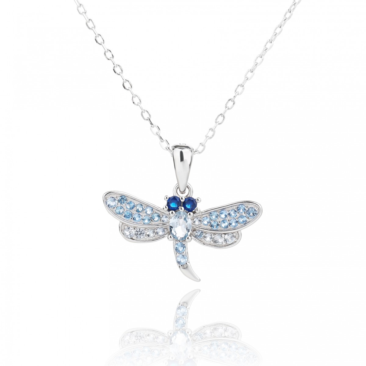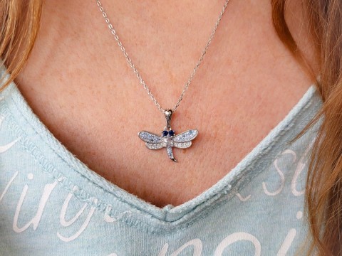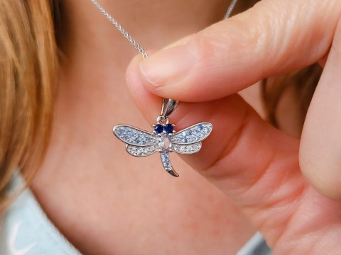 Naszyjnik wykonany z klasycznego łańcuszka o splocie ankier i zawieszki z motywem ważki. Zawieszkę można zdjąć z łańcuszka. Ważka zdobiona jest cyrkoniami w odcieniach niebieskiego. Srebro wykończone na wysoki połysk. Naszyjnik zapinany na federing. Posiada przedłużkę.
